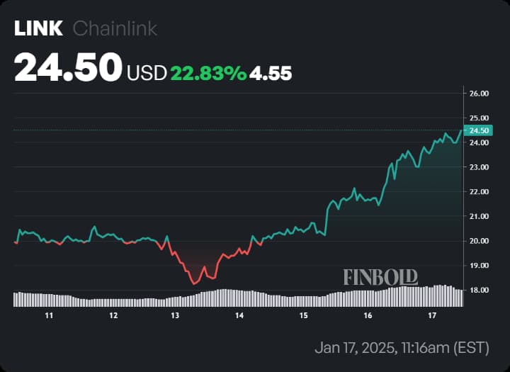At the time of writing, Chainlink is trading at $24.50, up 8% in the past 24 hours and 22% over the past week.
