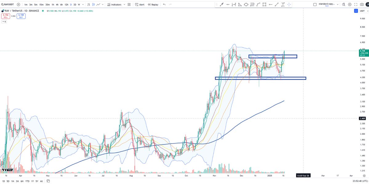 Raydium is currently testing levels not seen since 2022, signaling a remarkable resurgence in its price action. The token’s strong momentum suggests it is primed for further gains, with bullish sentiment dominating the market. However, a potential retest of the $6.5 level could be on the horizon, providing an opportunity for consolidation before the next leg up.