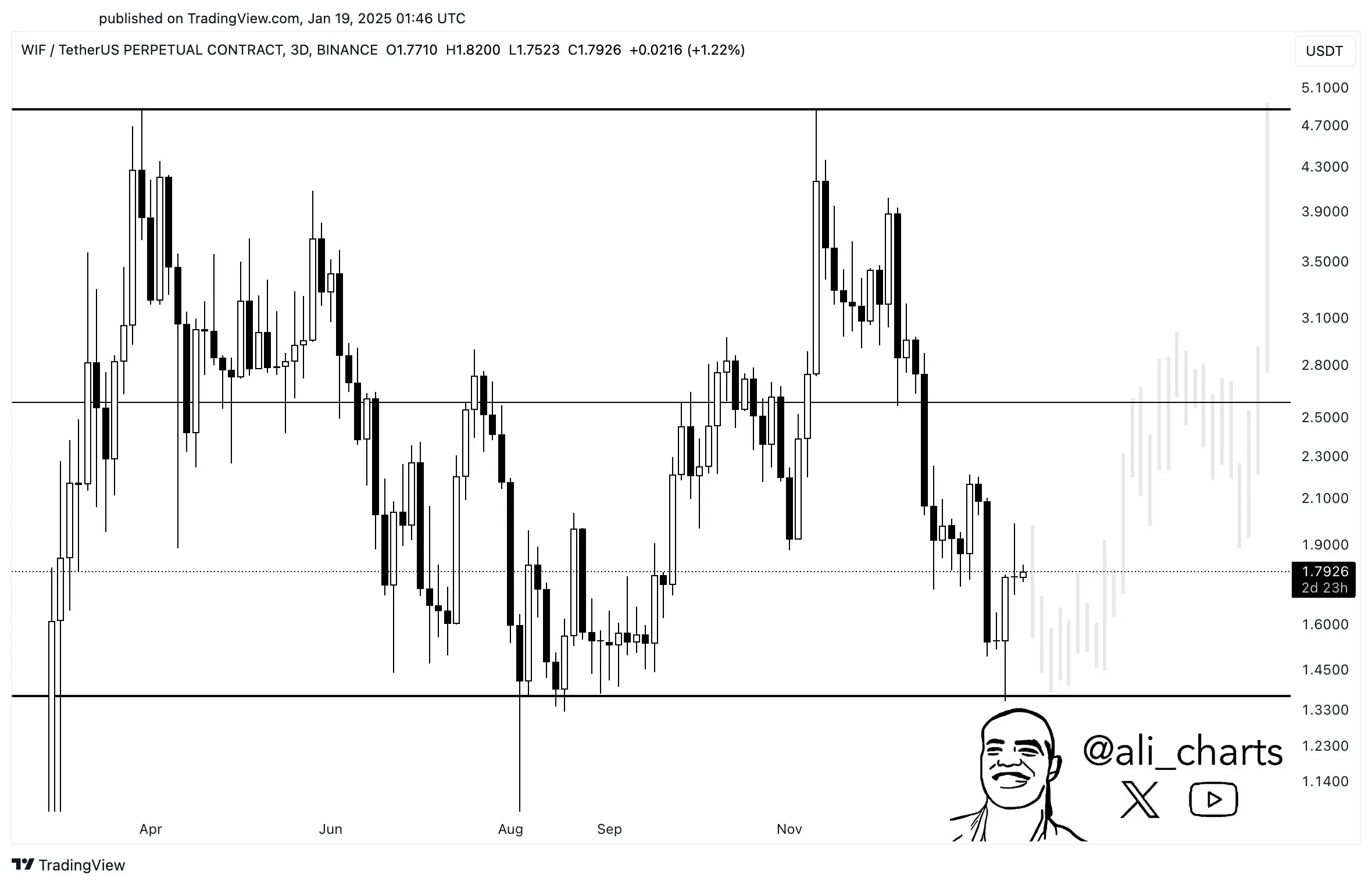 According to technical analyst ali_charts, the WIF/USDT trading pair is consolidating near the lower boundary of a well-defined parallel channel. In an X post, the analyst highlighted that this critical support level could act as a springboard for upward momentum, particularly as the price stabilizes following recent volatility.
