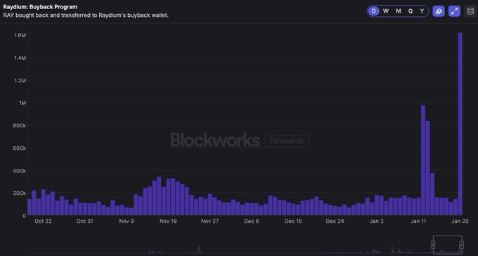 . @RaydiumProtocol just recorded its highest buyback day ever. Over 1.6M RAY was bought and transferred, totalling over 55M RAY accumulated from buybacks. That’s over 10% of the total supply of RAY accumulated just from buybacks.