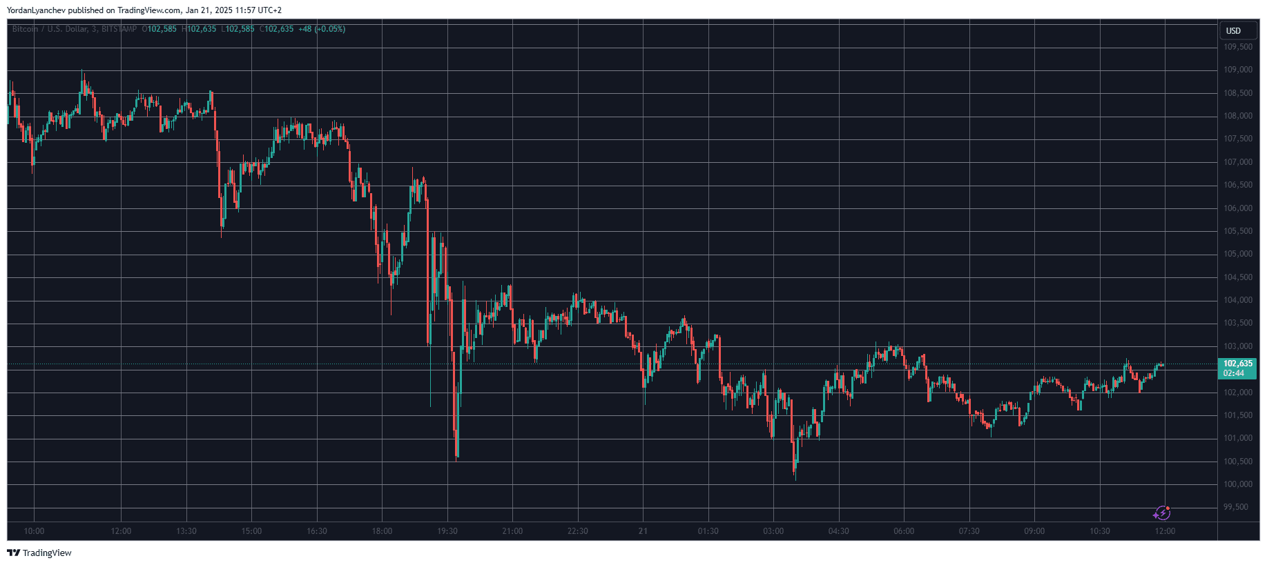 Once that began, BTC tumbled by five grand within minutes to $102,000. It bounced off during the speech but dropped once again as it ended due to the lack of any mentions of crypto whatsoever. The largest digital asset dropped to $100,000 before it added a few grand and now sits above $102,000.