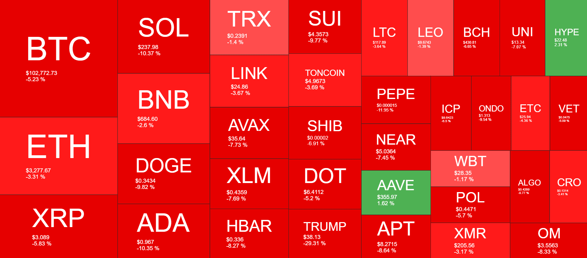 In contrast, XRP is down by 6%, AVAX, XLM, and HBAR by around 8%, while SOL, DOGE, and ADA have plunged by up to 10.5%.