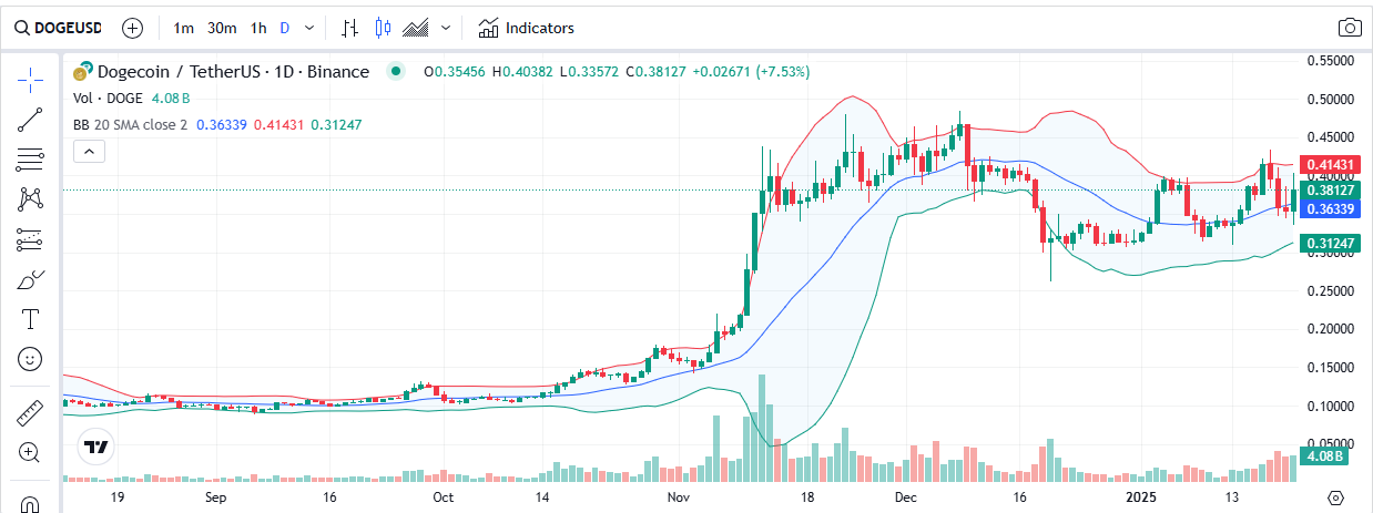 - DOGE soars 39% to $0.38, testing upper Bollinger Band; renewed investor interest drives market cap up by 2.43% despite lower volume.