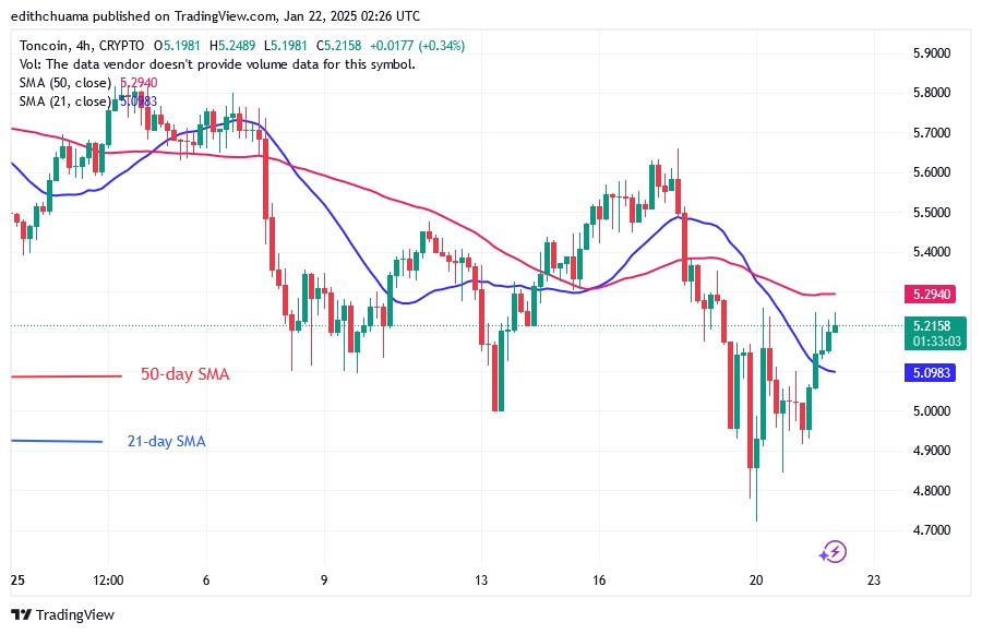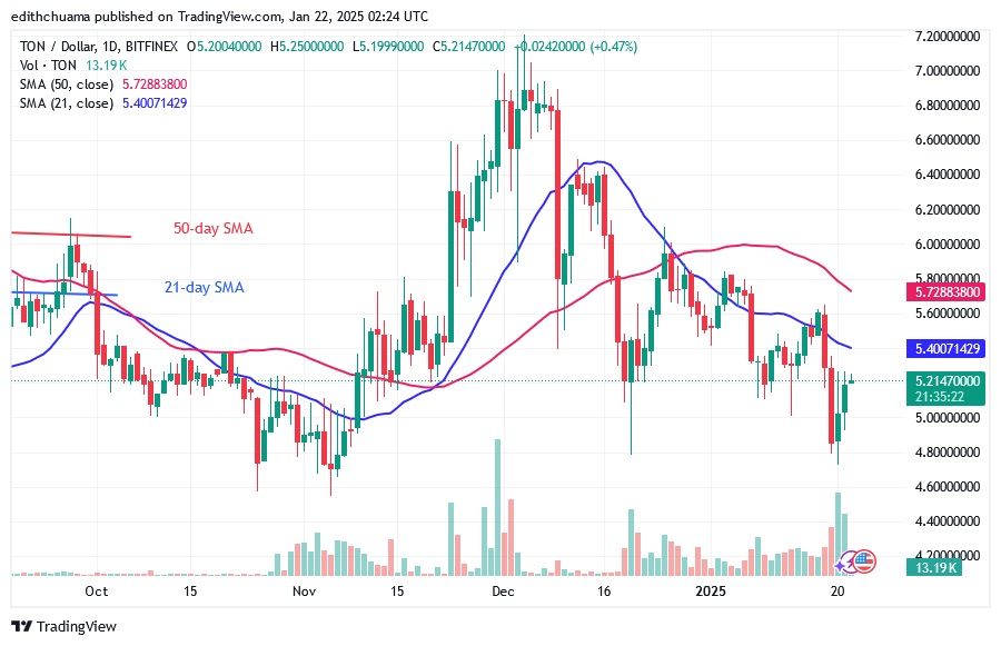 Bulls bought the dips and started a rise above the key support of $5.00. Since December 20, 2024, the altcoin has been moving above the $5.00 support but below the moving average lines or resistance at $6.00. Today, TON is rising towards the moving average lines. If TON breaks above the moving averages, an uptrend will start. Otherwise, the trend will continue below the moving averages. TON is currently trading at $5.19.