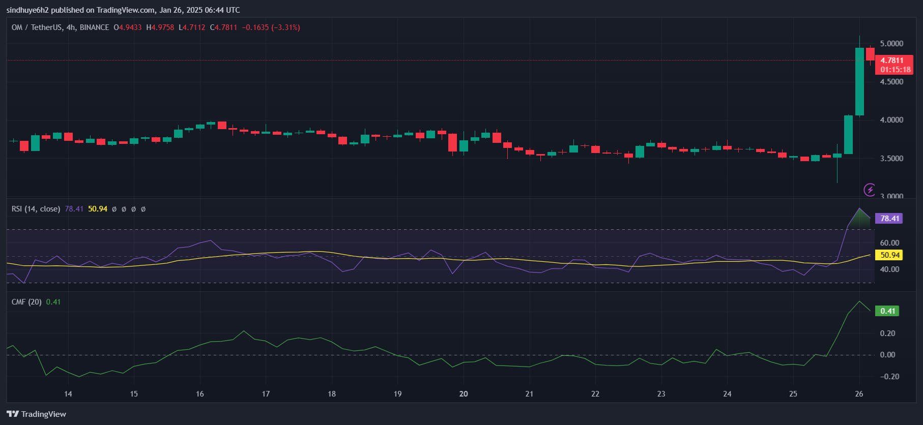 MANTRA (OM) achieved a new milestone today, touching $5 before retreating slightly. The token currently trades at $4.75, representing a 36.72% gain in the last 24 hours. Its market cap has surged to $4.57 billion, up 36.74%, with a massive spike in trading volume to $376.69 million, an increase of 700.08%. The market cap ratio is 8.16%, signaling robust trading activity.