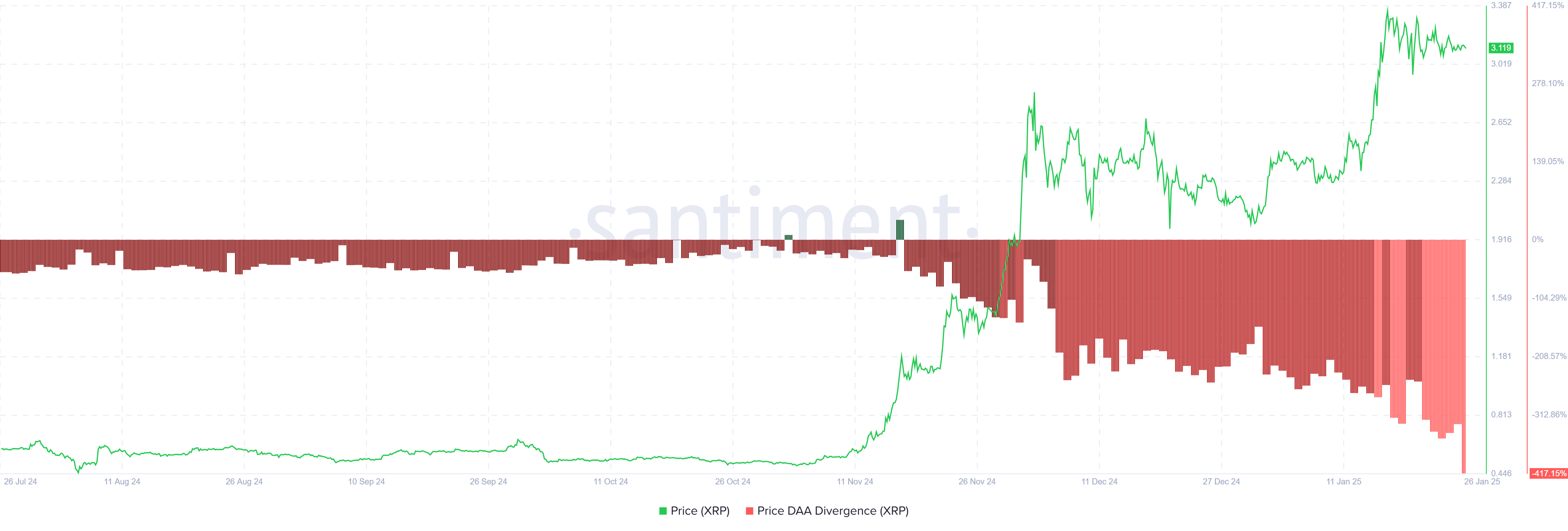 One of the key signals pointing toward a potential correction is the Price Daily Active Addresses (DAA) Divergence, which is flashing a sell signal. Despite the bullish price action, the number of active wallet addresses interacting with $XRP has seen a noticeable decline. This divergence between price and participation is often a sign of waning investor interest, which could lead to a negative impact on $XRP’s price.