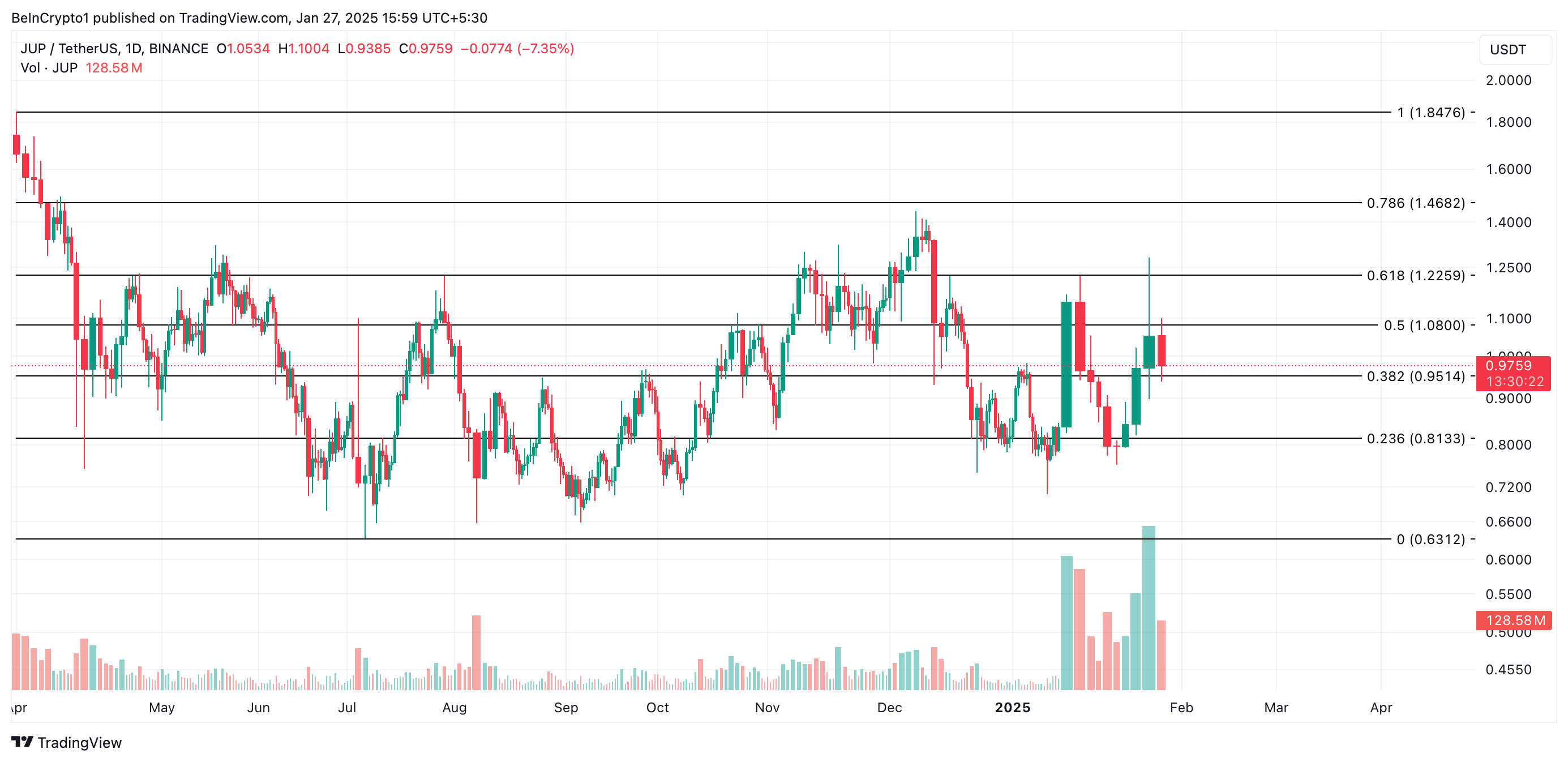 This surge is accompanied by an 181% uptick in daily trading volume, indicating that the price growth is due to the actual demand for JUP tokens. If demand strengthens, the altcoin’s value could rally toward $1.08.