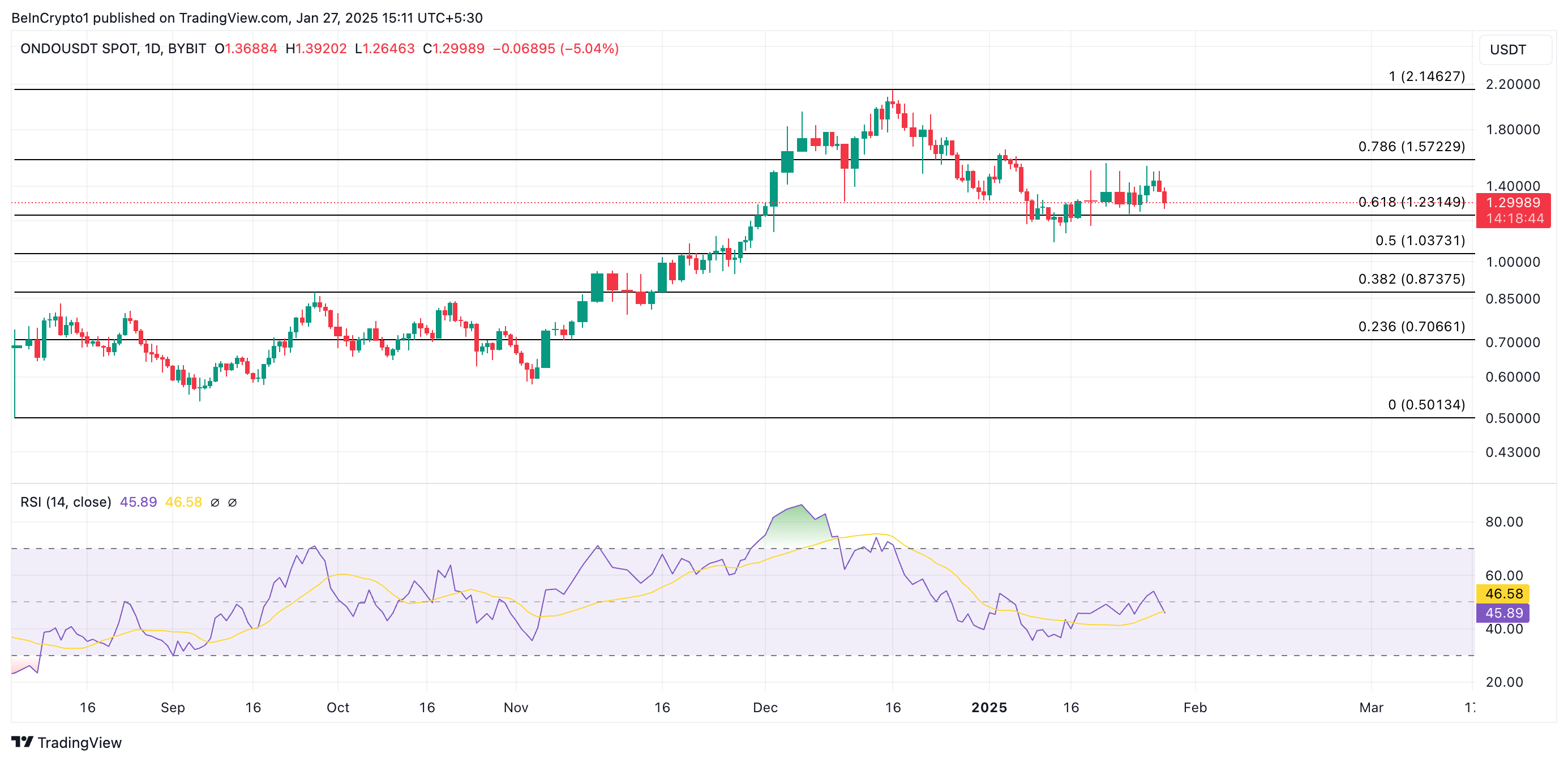 At 45.89 and in a downtrend, ONDO’s RSI indicates that selling pressure is gaining momentum. If this strengthens, ONDO’s price could break below $1.23 and fall toward $1.03. On the other hand, if ONDO demand spikes, it could drive its value up to $1.57.