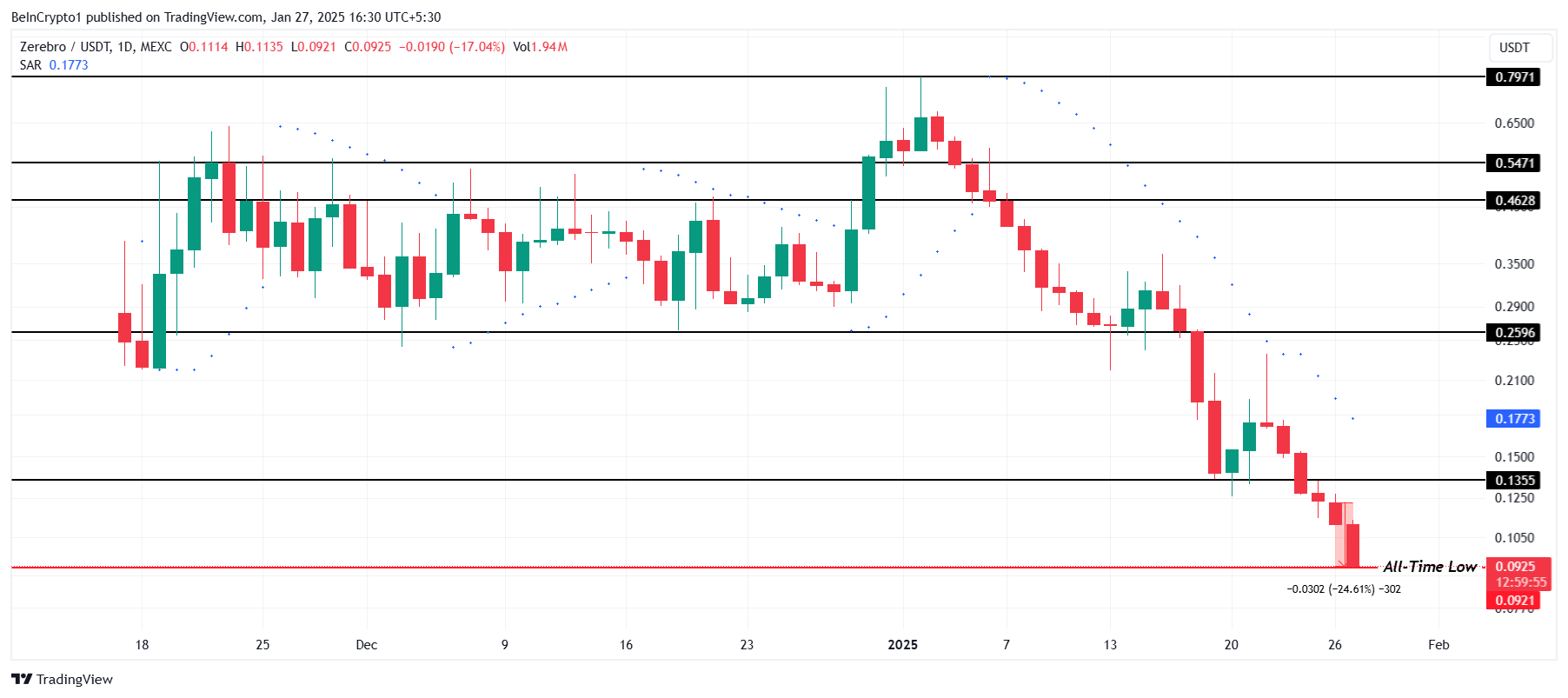 ZEREBRO’s price dropped 24% in the past 24 hours, now trading at $0.0925 and briefly hitting an intraday low of $0.0921. This sharp decline has resulted in a new all-time low, reflecting intensified bearish sentiment and a lack of immediate buying support for the altcoin.
