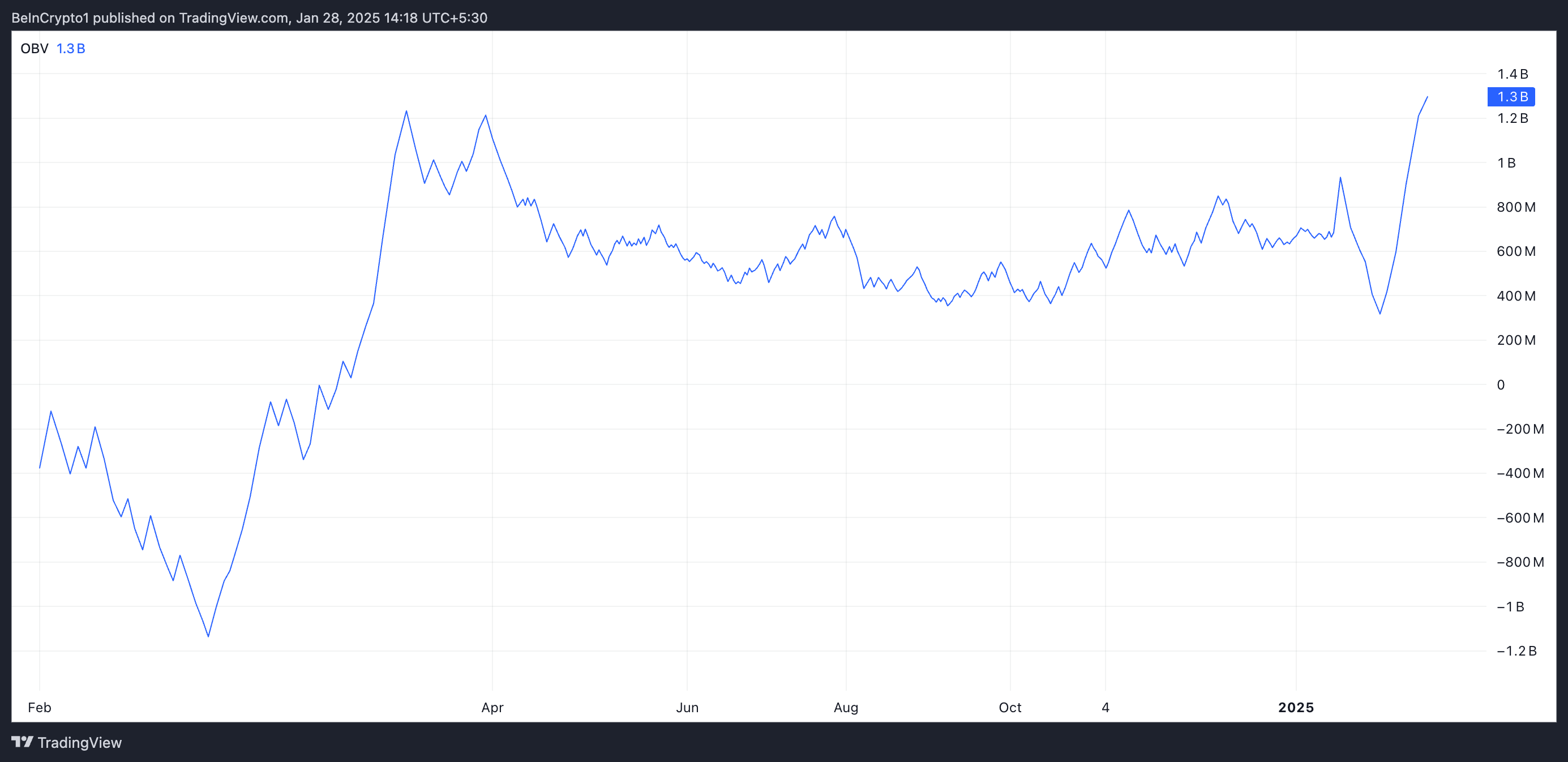 An asset’s OBV measures money flow into and out of it to predict price movements. It suggests increasing buying pressure when it climbs like this, as more volume is associated with upward price movement, indicating a potential bullish trend.