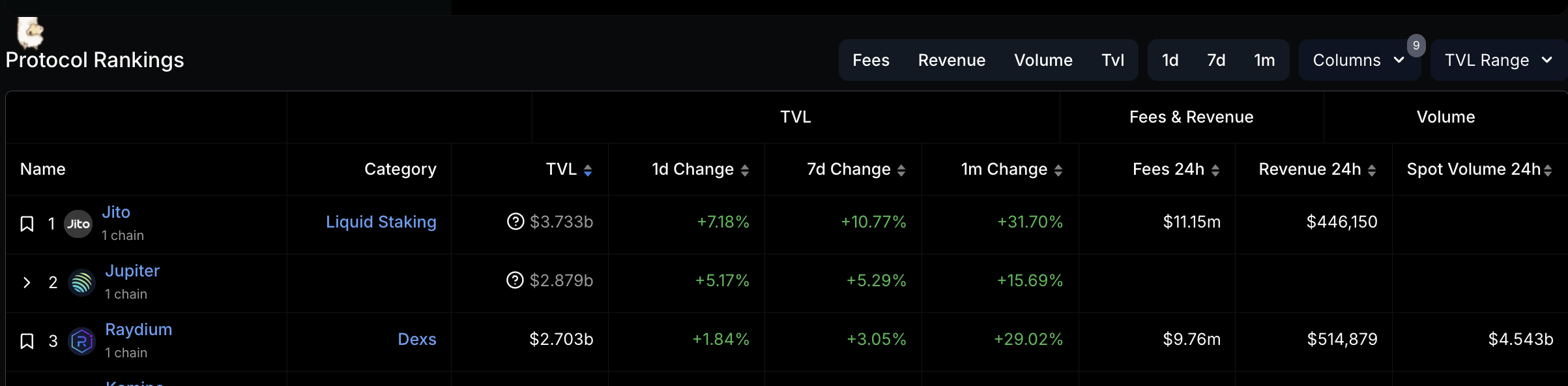 Solana Protocol Rankings. Source: DefiLlama