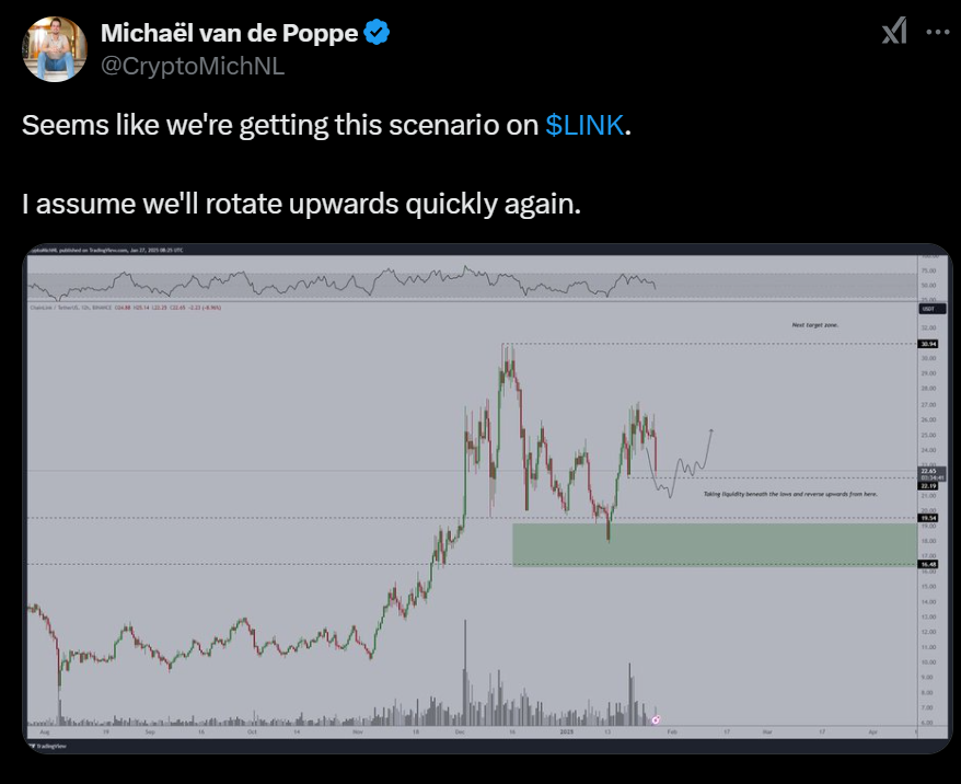 $LINK’s drop to $22.65 allowed the market to run some liquidity off-stop losses below prior lows.