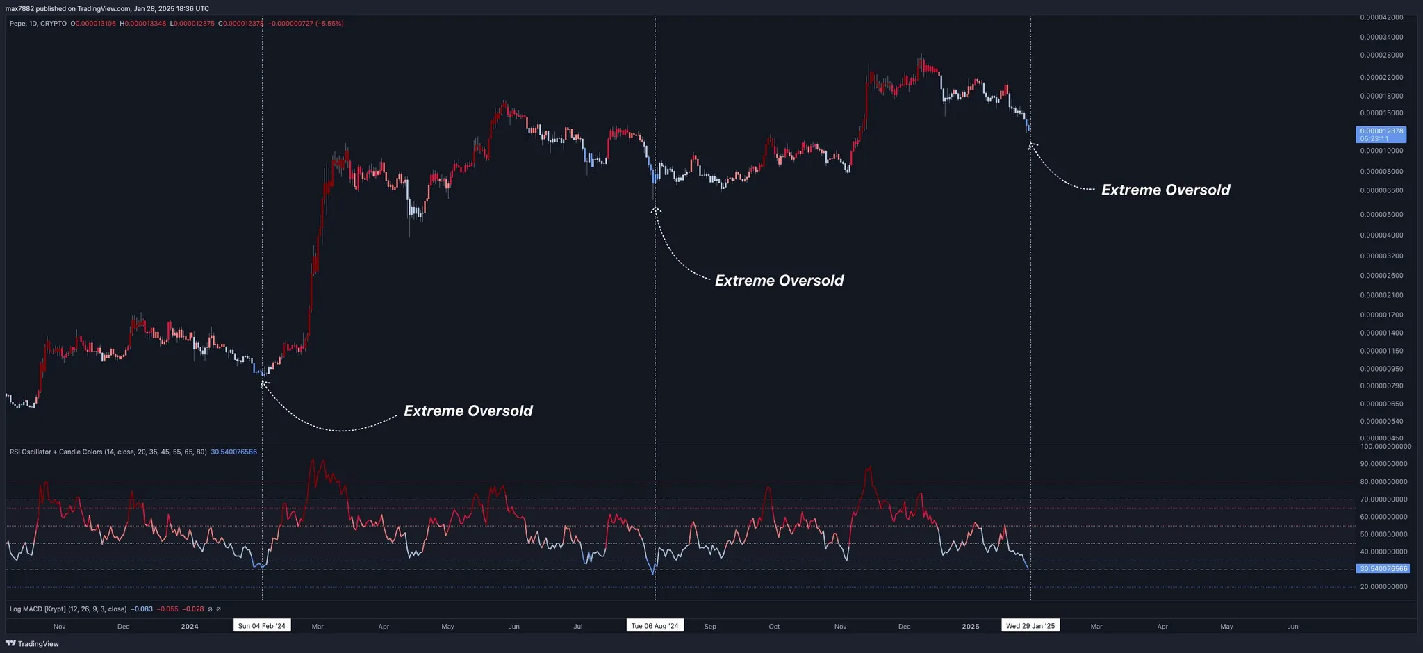 Currently, $PEPE has once again entered an extreme oversold phase, mirroring the conditions seen on February 4th, 2024, and August 6th, 2024. Both preluded robust upward movements.
