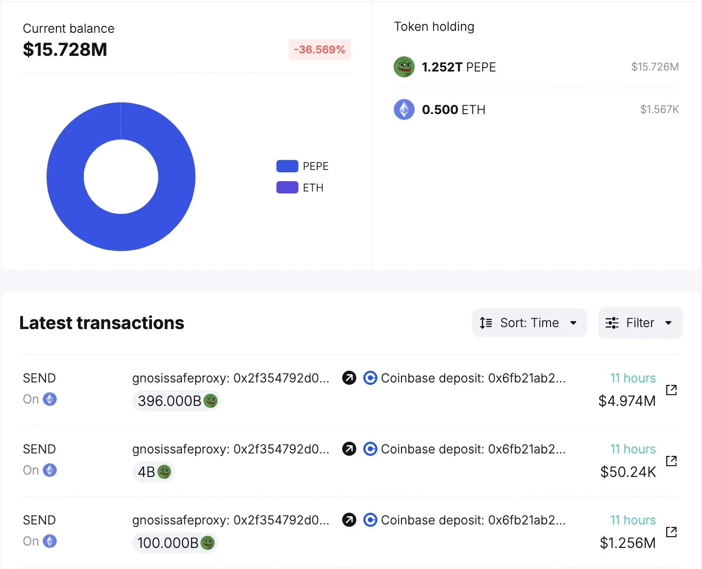 Currently, the whale retains 1.25 trillion $PEPE coin valued at approximately $15.73 Million.