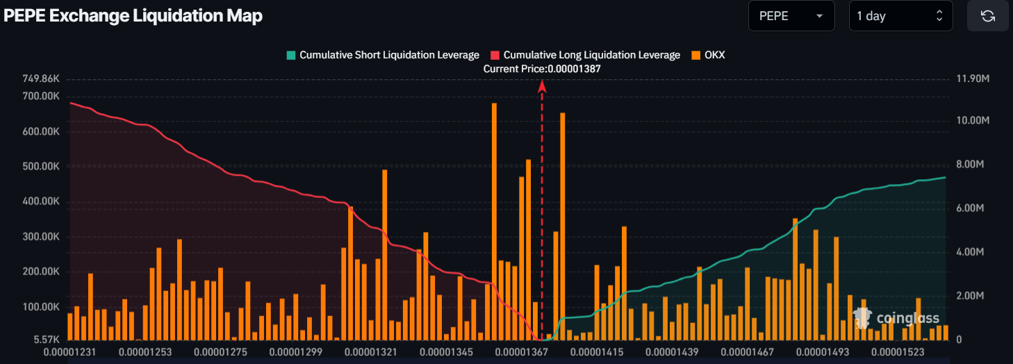 According to on-chain data, the major liquidation area is near $0.00001359, where bulls are over-leveraged and currently hold $2.50 million worth of long positions. Conversely, $0.00001405 is another key level where short sellers, with $1 million in over-leveraged positions, could be liquidated if the price reaches this level.