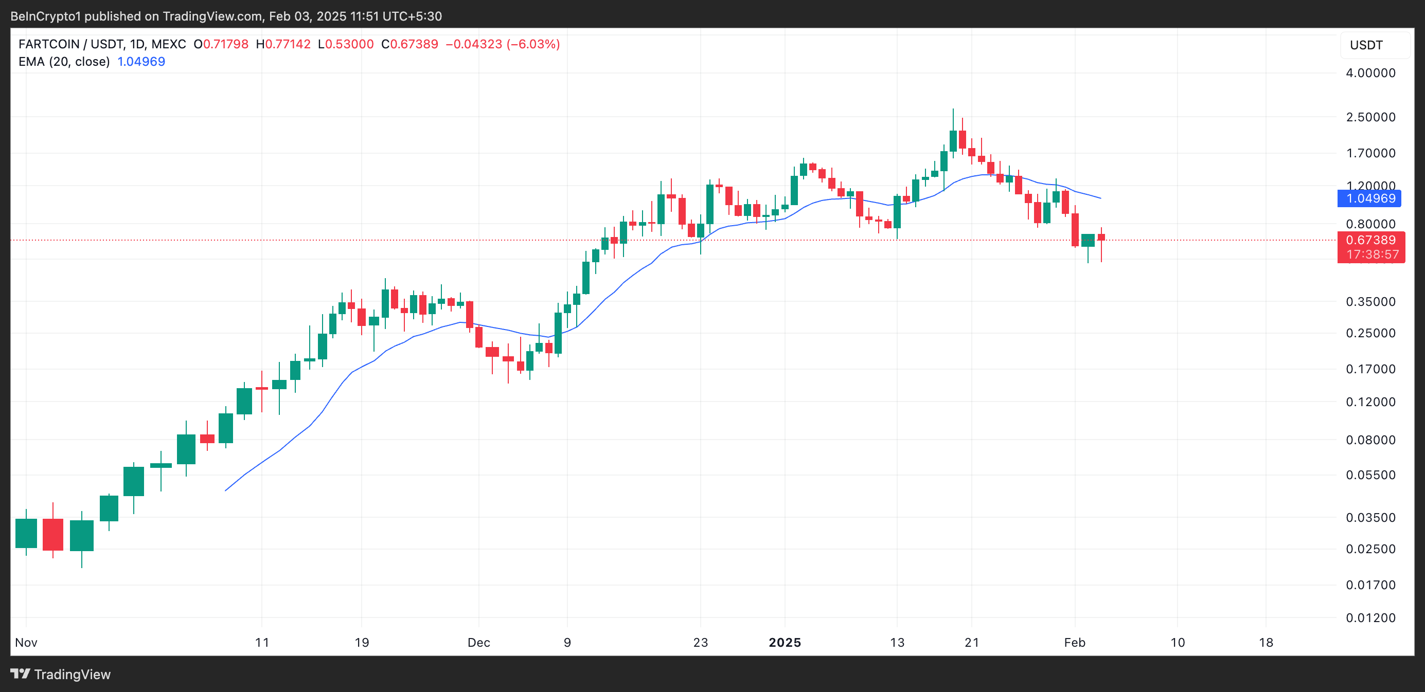 An asset’s 20-day EMA measures its average trading price over the past 20 days, giving more weight to recent prices to better reflect short-term trends. When an asset’s price falls below this key moving average, it signals weakening momentum and a bearish shift. This suggests that FARTCOIN’s selling pressure is increasing, and unless demand picks up, the asset could continue declining.