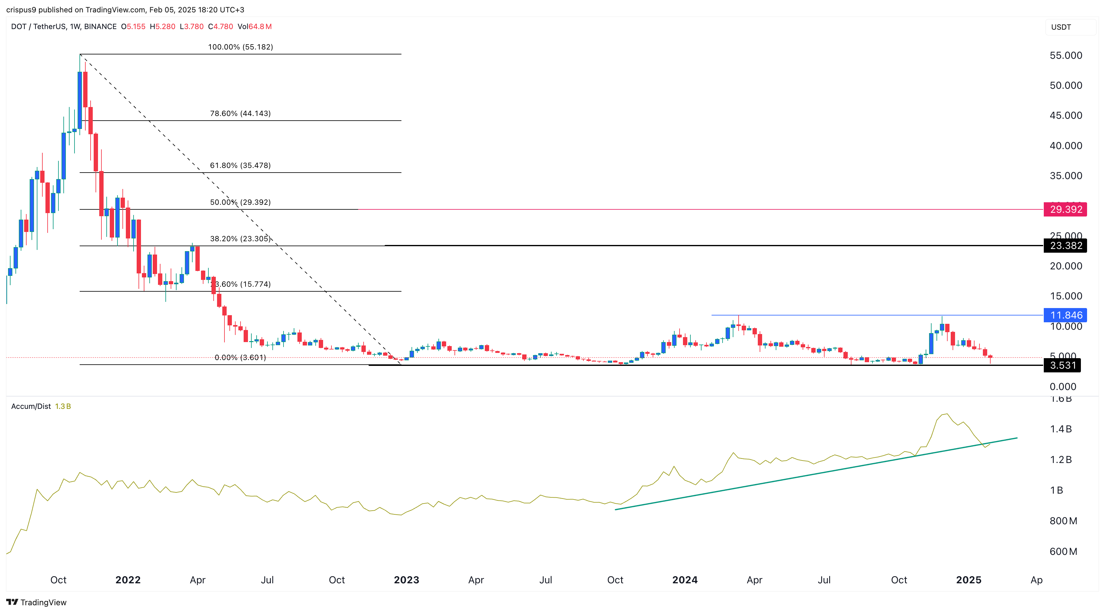 The other potential catalyst for Polkadot is its technical indicators. The weekly chart shows that DOT has remained in a tight range since 2022, struggling to break below the $3.53 support level or above the $11.85 resistance.