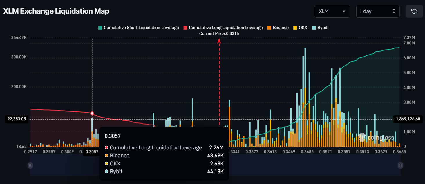Today, February 6, 2024, the on-chain metric XLM exchange liquidation map revealed that traders holding long positions are exhausted and currently over-leveraged at the $0.3057 level, with $2.26 million worth of long positions. Meanwhile, traders holding short positions are dominating, as they are over-leveraged at $0.355, with $5.25 million worth of short positions at this level.