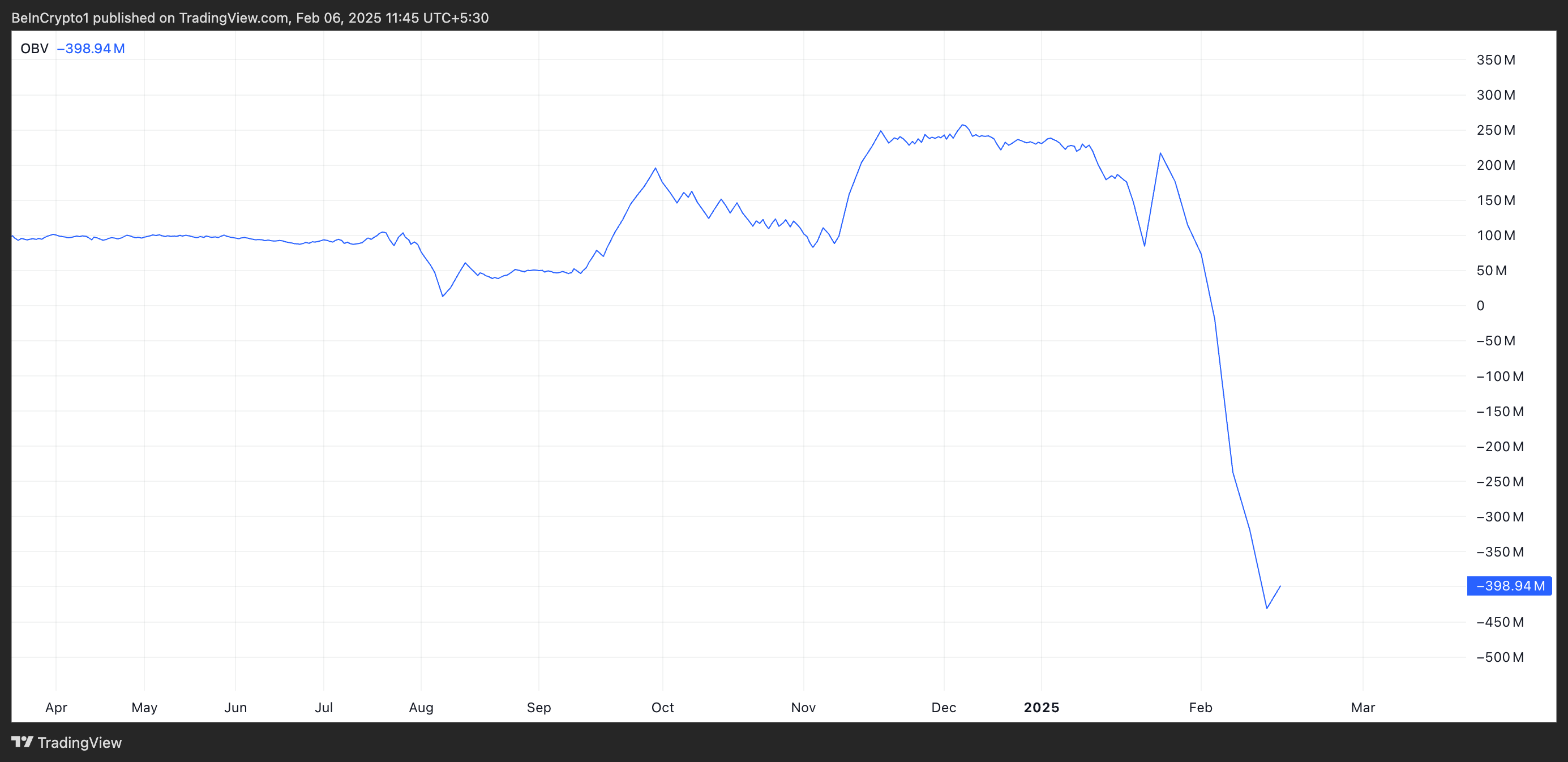 A falling OBV like this indicates that selling pressure outweighs buying pressure. It means more traders are offloading the asset than accumulating it.
