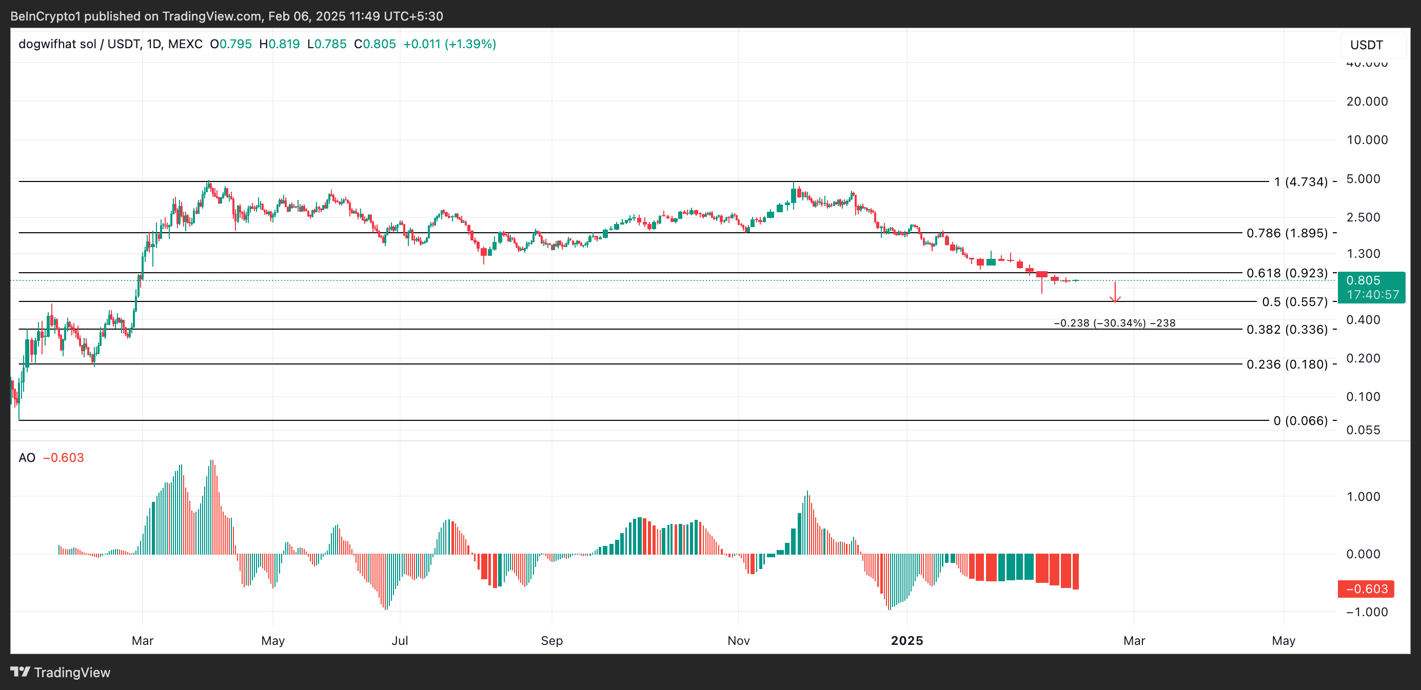 Readings from WIF’s Awesome Oscillator (AO) confirm the waning demand for the altcoin. This indicator posts red downward-facing histogram bars as of this writing, reflecting the high selling pressure. Its value is -0.60.