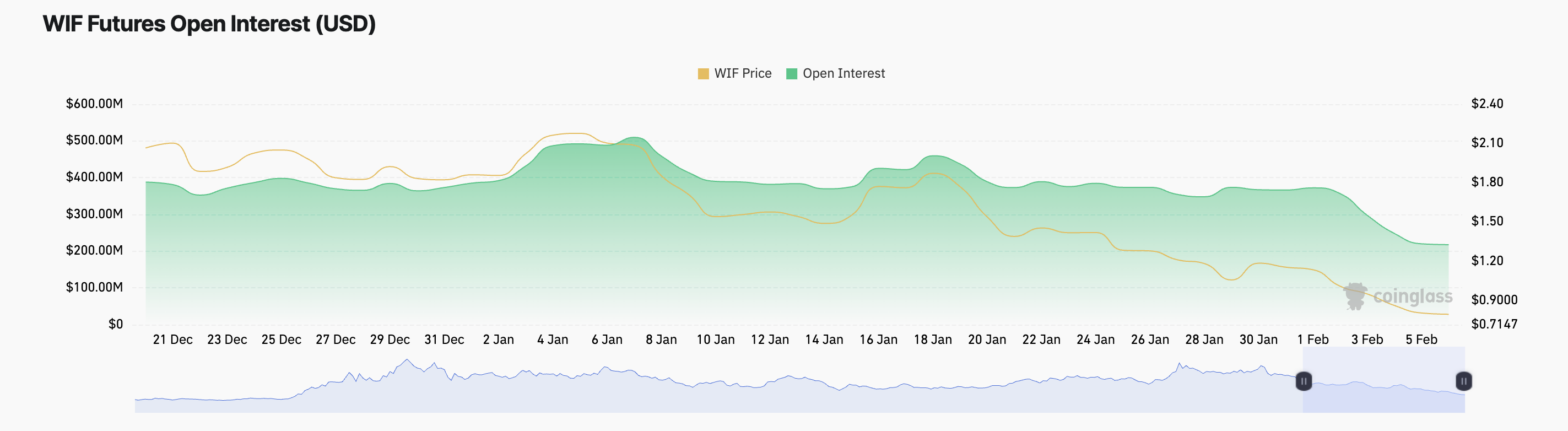 Additionally, WIF’s open interest reinforces this bearish outlook. It has steadily declined since the start of February, plunging by 42%.
