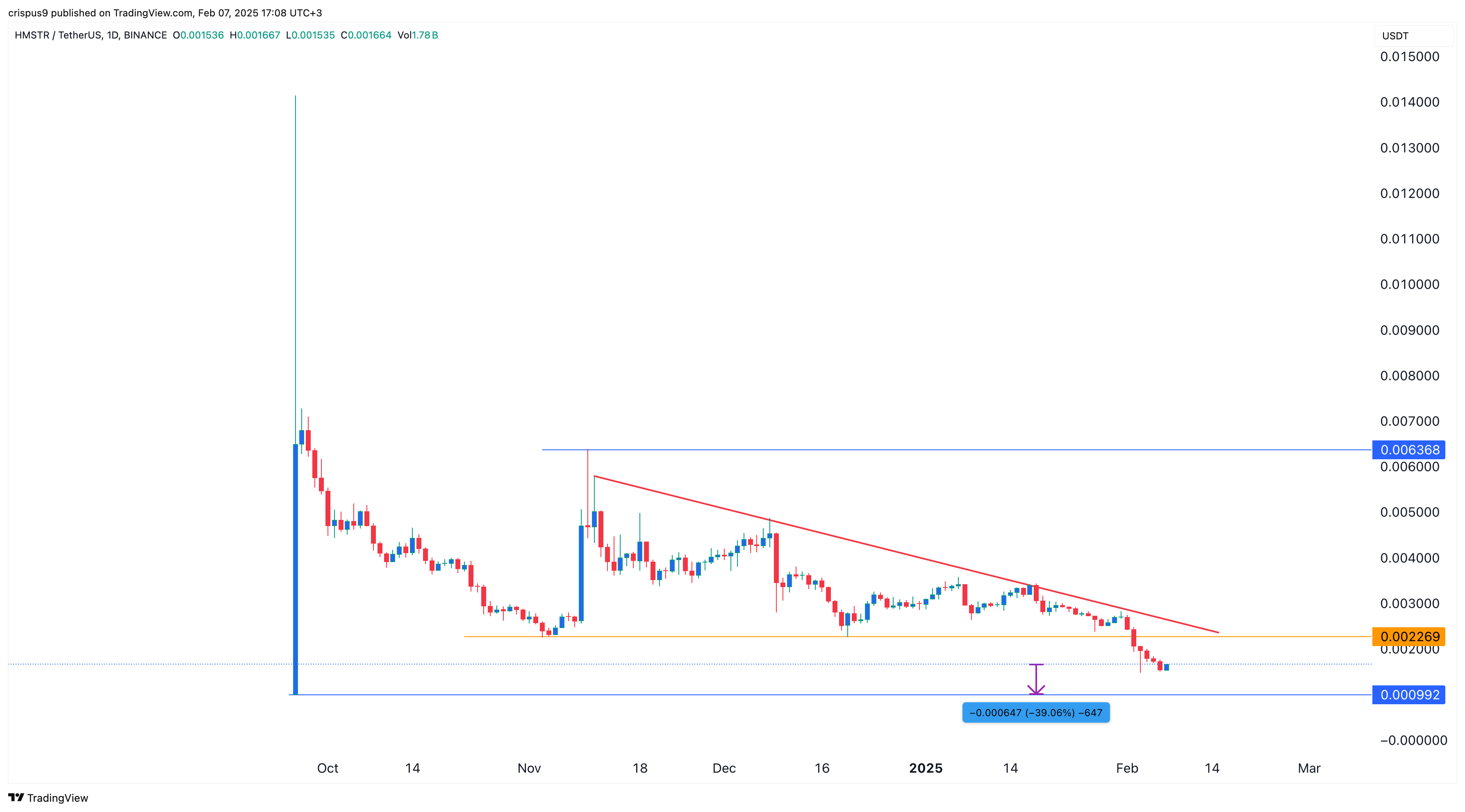 The daily chart shows that the HMSTR token price has been in a downtrend over the past few weeks. It recently made a strong bearish breakdown below the key support level of $0.002270.