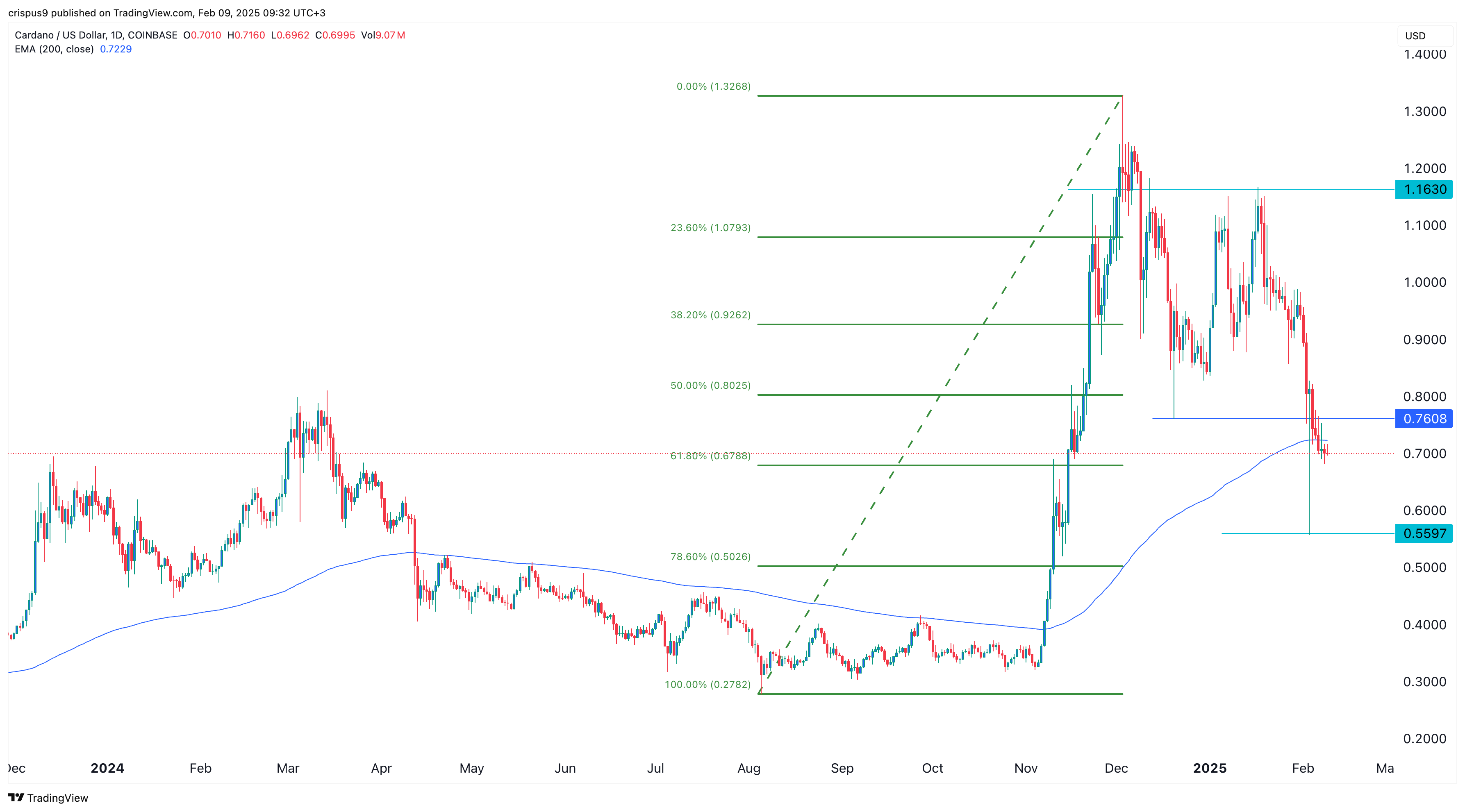 The daily chart shows that the ADA price has remained under pressure in the past few months, moving from $1.3268 in November to $0.70 today. It has dropped below important support levels, including the 50% Fibonacci Retracement point at $0.80.