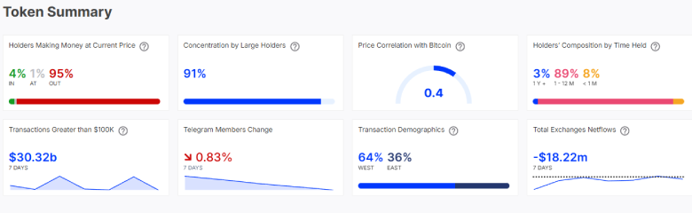 Adding to investor concerns, 91% of Toncoin’s supply is concentrated among large holders, indicating a potential centralization risk. This heavy concentration creates liquidity and volatility issues, as whale momentum could significantly impact price movement.