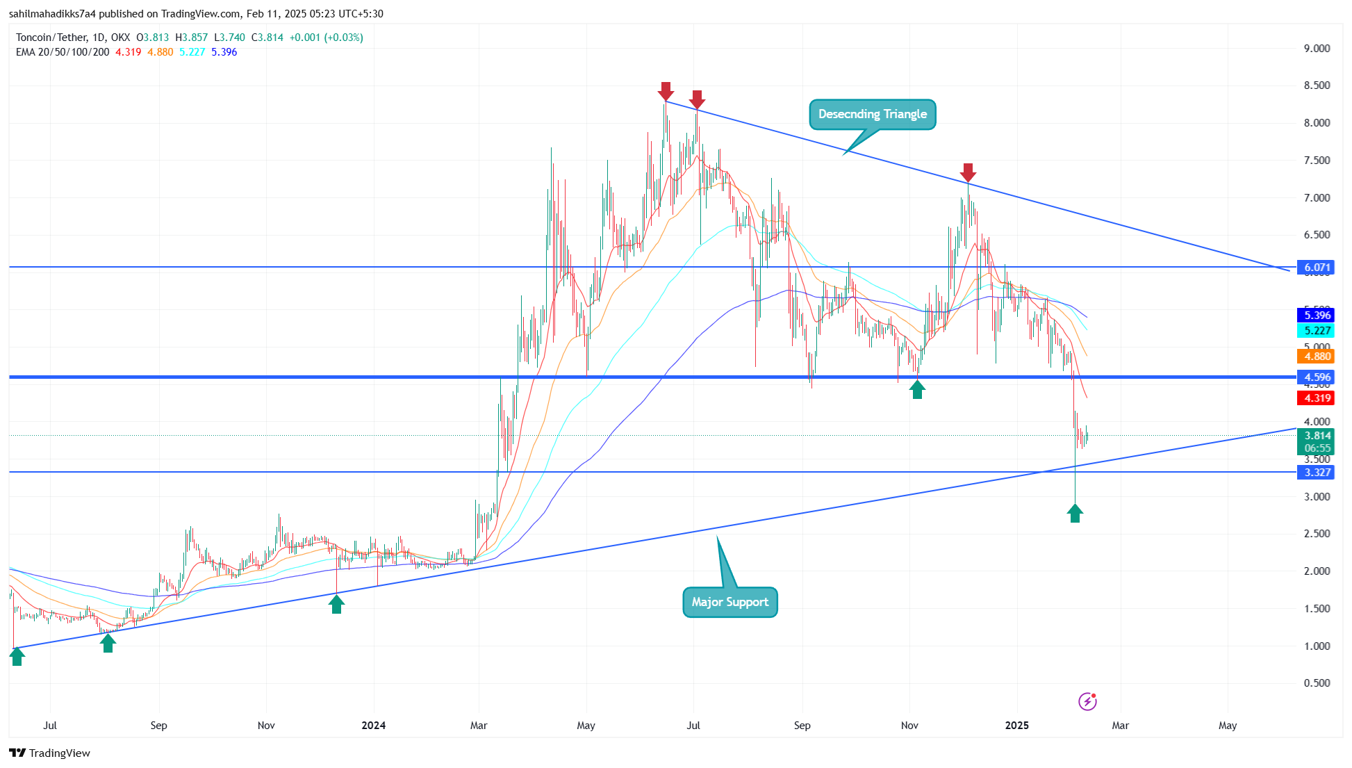 Thus, the Toncoin price plunged to the current trading price of $3.8, seeking support at a long-coming support trendline. Since June 2023, the ascending trendline has acted as a crucial pullback support for buyers to build bullish momentum.