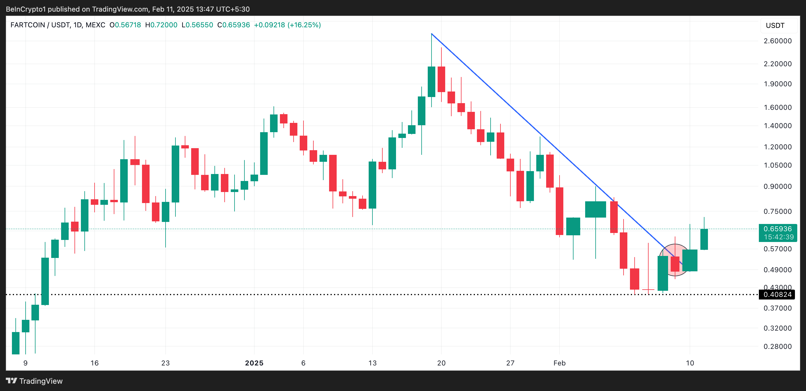 However, the resurgence in FARTCOIN’s demand and the resulting break above this trend line marks a bullish shift in the market trend.