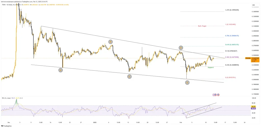This surge in network adoption comes as the TRX cryptocurrency exhibits bullish technical signals, with price action attempting to break out of a descending wedge pattern. Increased on-chain activity and heightened user engagement may further bolster buying momentum, supporting the token’s potential move toward key resistance levels at $0.255 and $0.268.