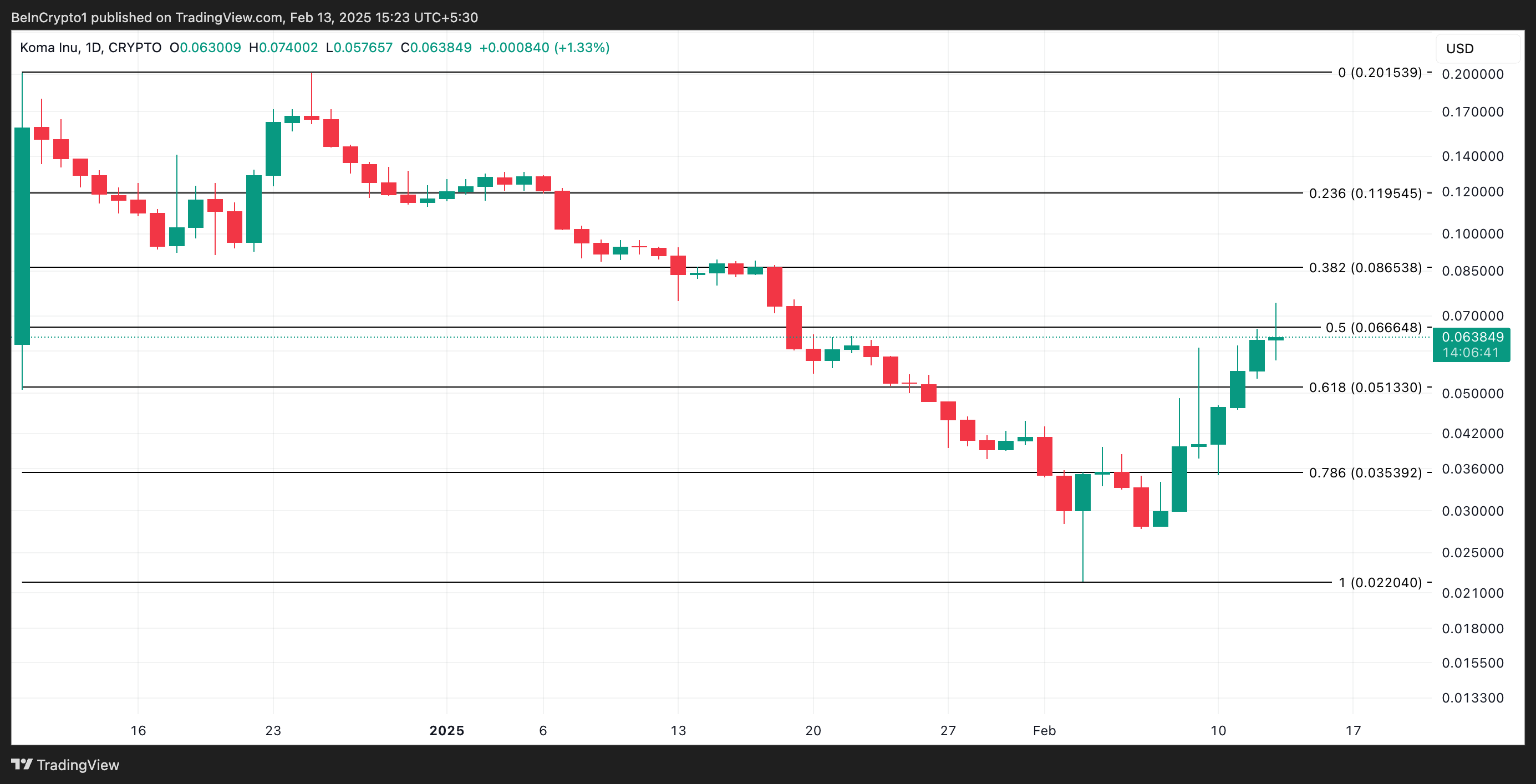 This double-digit rally marks a continuation of KOMA’s extended price rally, which began after it fell to an all-time low of $0.022 on February 3. Since then, the meme coin’s value has soared by 186%.