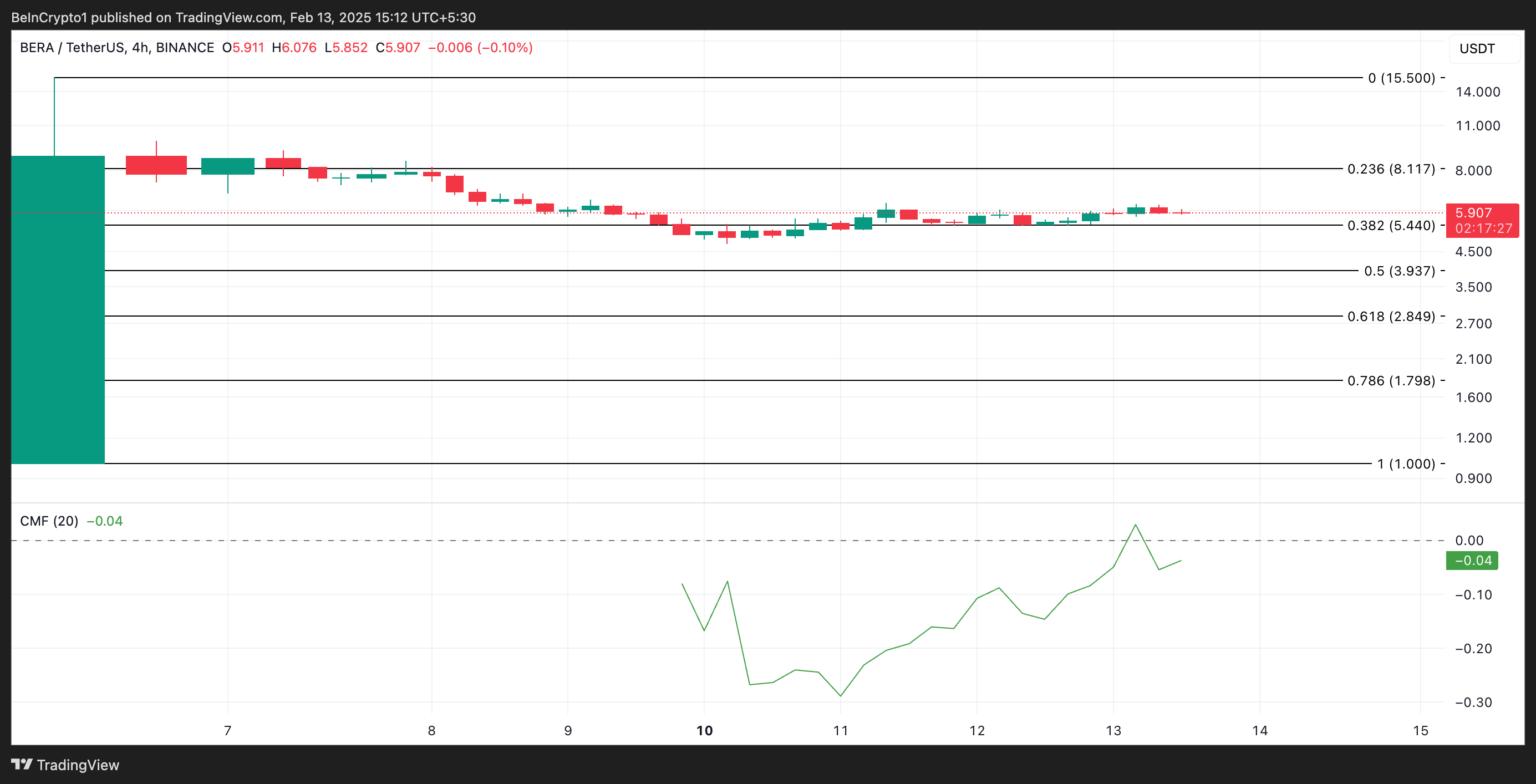However, its negative Chaikin Money Flow (CMF) on the four-hour chart signals a bearish divergence, suggesting a potential price correction in the near term. At press time, BERA’s CMF is below zero at -0.04.
