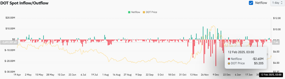 However, DOT Spot Inflow/Outflow revealed a notable shift in market dynamics with the Netflow turning negative at -$2.60M as of 12 February 2025, following three days of positive net inflows.