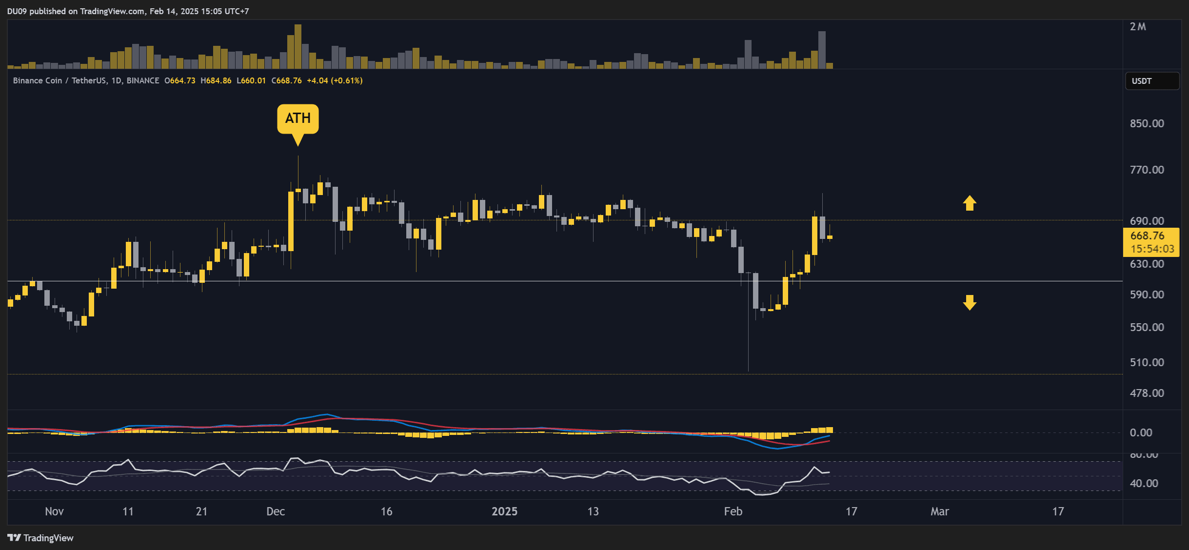 After BNB touch $500 for a brief moment in early February, the price shot up to $700 in less than 10 days. This reversal was abrupt and significant, confirming that the support at $600 is well defended by buyers. At the time of this post, BNB is under the key resistance at $700.