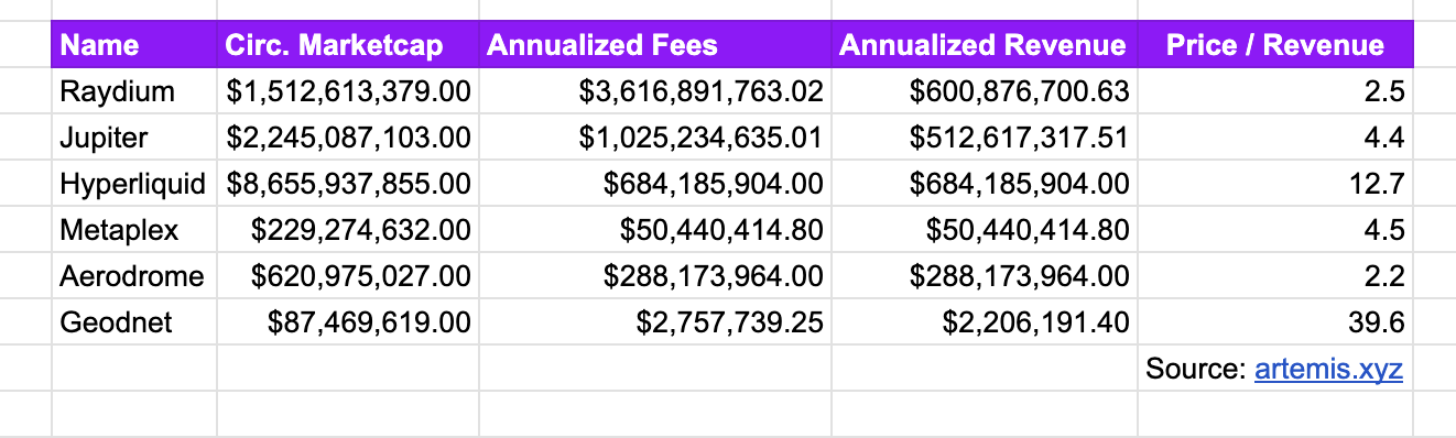 Applications like Raydium, Hyperliquid, Metaplex, GEODNET, and Jupiter are all trading at reasonably “rational” P/S ratios that are based on consistent cash flows and more measurable growth potential.