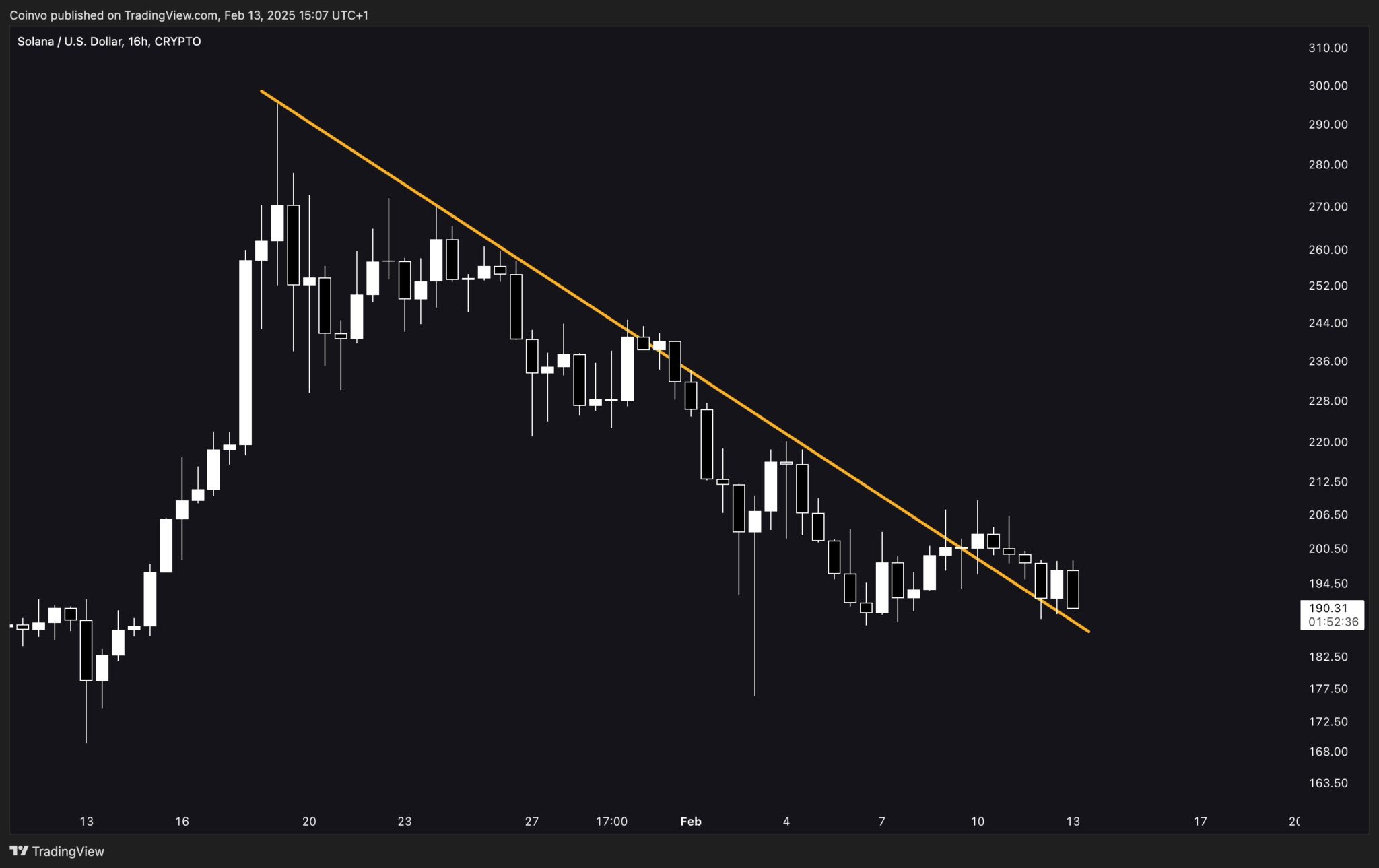Solana’s (SOL) price action from a 16-hour perspective saw a breakout from a descending trendline that had defined price resistance since late January 2025.