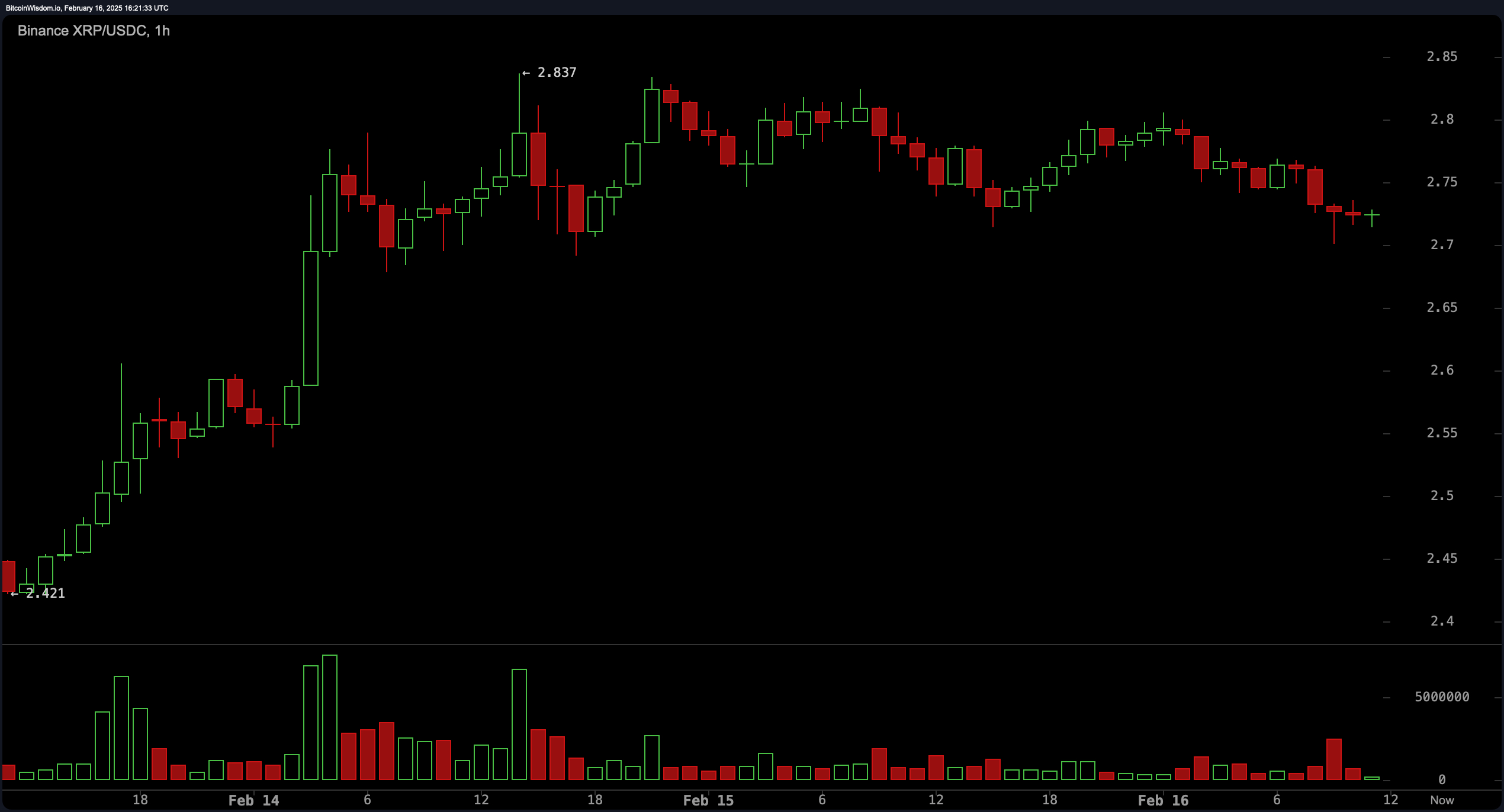 XRP trades at $2.72 on Feb. 16, 2025, consolidating near resistance as traders weigh bullish momentum against fading volume signals.