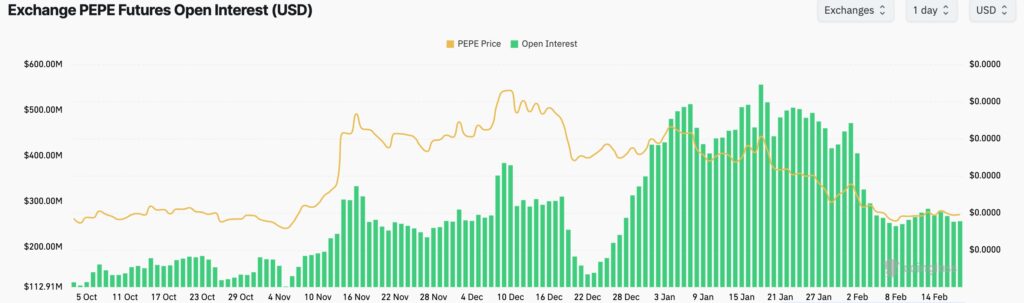 Pepe coin has also seen its futures open interest stabilize in the past few months, after dropping from $556 million in January to $257 million today. Falling futures open interest is a contrarian catalyst for buying an asset. For example, Pepe’s open interest plunged to $144 million in December last year, leading to a strong rebound to a record high.
