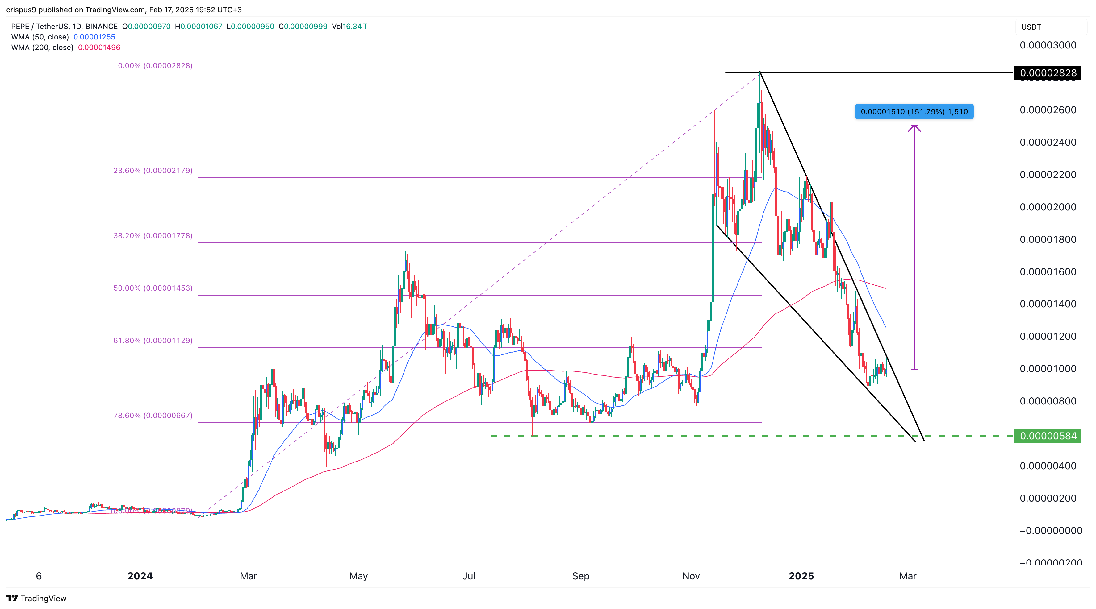 However, there is also a case for a bullish reversal. Pepe has formed a falling wedge pattern, with its trendlines converging, often a precursor to a breakout. If this scenario plays out, Pepe could rebound toward $0.000025, a 150% gain from its current level.