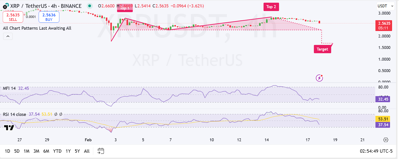 The support levels for XRP stand at $2.60 together with stronger defensive positions located between $2.50 and $2.45. Experts believe the price likely will descend from $2.20 to $2.00 if it passes under these two key support areas.The price breaking below the rising wedge pattern confirms that the market outlook will turn bearish.