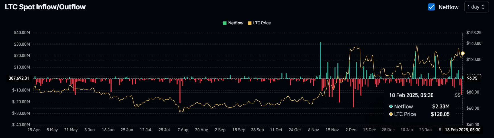 However, this interest from long-term holders differs and opposes the bullish sentiment, as reported by the on-chain analytics firm Coinglass. Data from spot inflow/outflow reveals that exchanges have witnessed an inflow of over $2.3 million worth of LTC tokens, suggesting a potential sell-off by long-term holders.