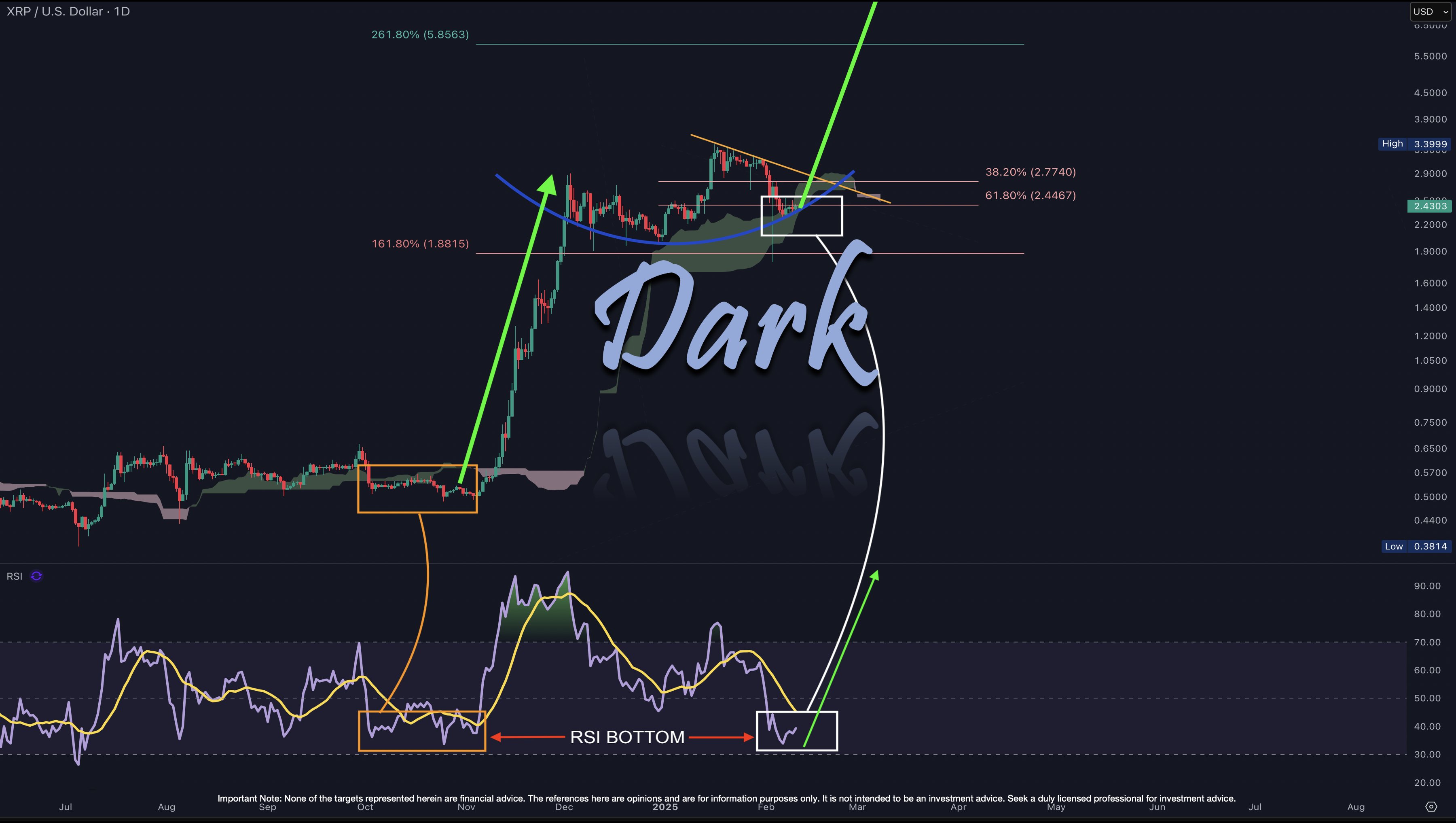 Further reinforcing his bullish outlook, Dark Defender identified another ambitious target for $XRP, suggesting it could nearly triple its previous all-time high of $3.40, aiming for a new target of $8.76, which implies a potential 243% uptrend from current levels.