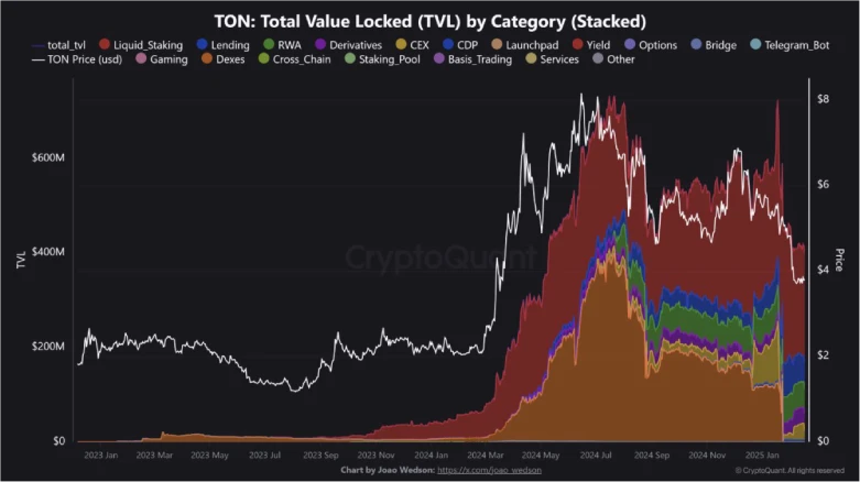 A key indicator, the TON Staking TVL Ratio, which measures the proportion of TVL allocated to Liquid Staking and Staking Pools relative to the total TVL, has been steadily rising. This suggests that while overall liquidity in the network is declining, a greater share of locked funds is being directed toward staking.