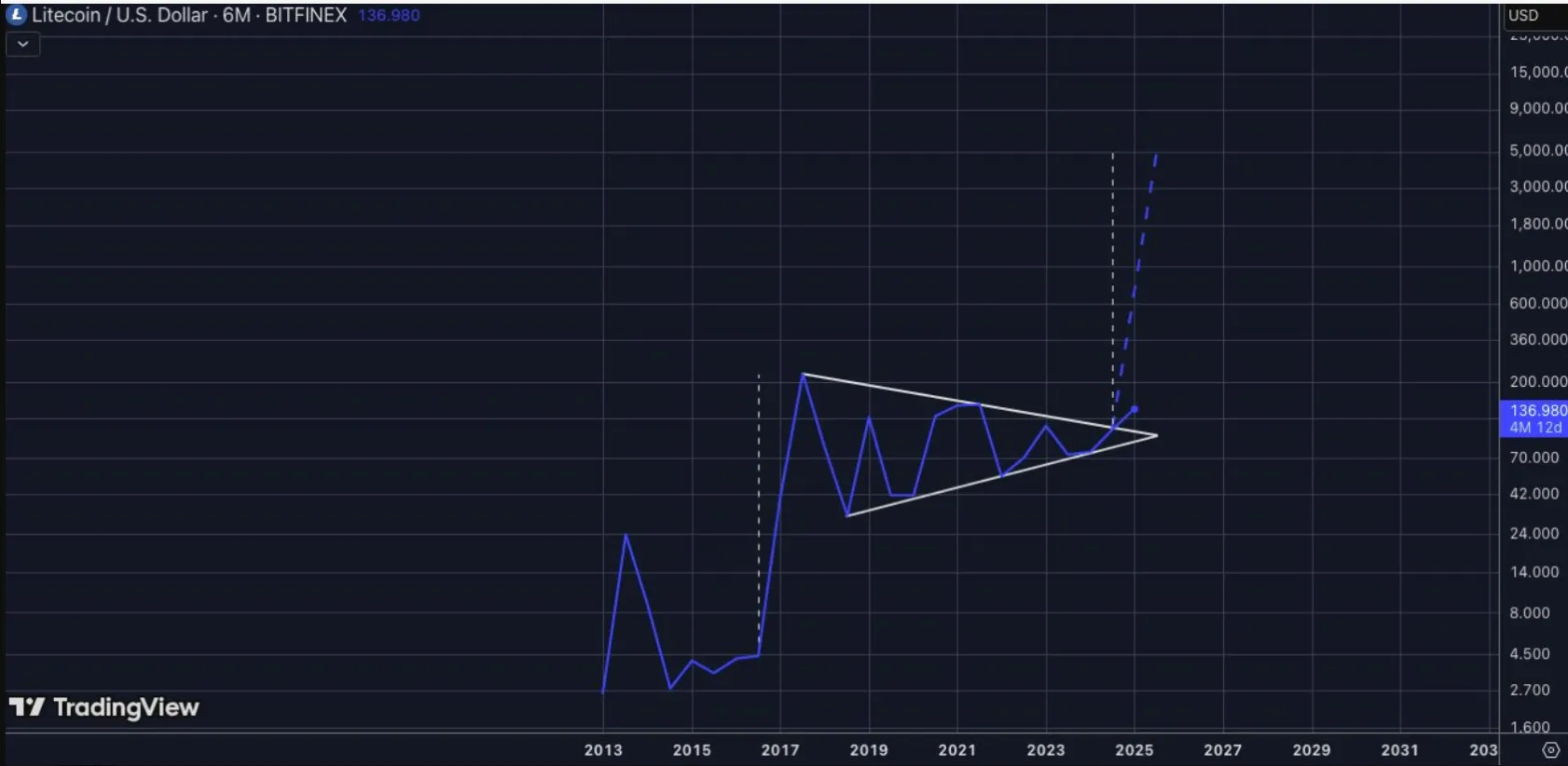 Pundits are expecting a major boost in the ETF if the SEC ratifies the decision. Market analyst Crypto Surf has supported Litecoin in reaching $5,000 in the current cycle based on the symmetrical triangle breakout from the six-month chart. Such a transition would mean an increase of its market capitalization by almost 40 times, raising it to $ 377 billion based on the circulating supply.