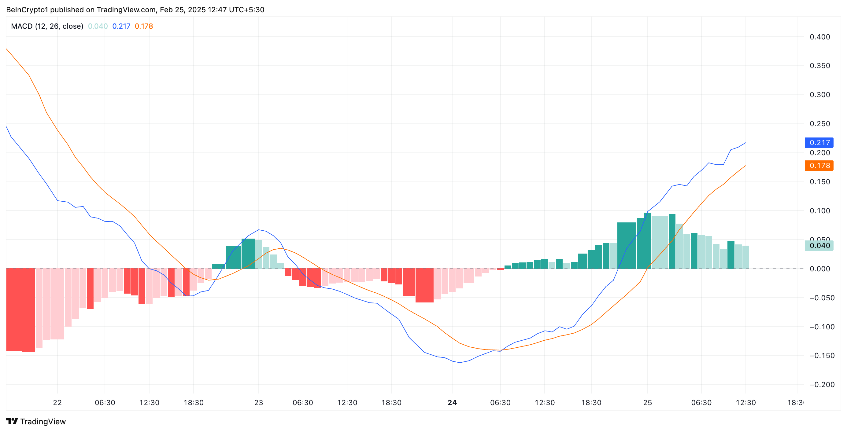 The setup of its Moving Average Convergence Divergence (MACD) confirms the likelihood of this bullish breakout. At press time, IP’s MACD line (blue) rests above its signal line (orange).