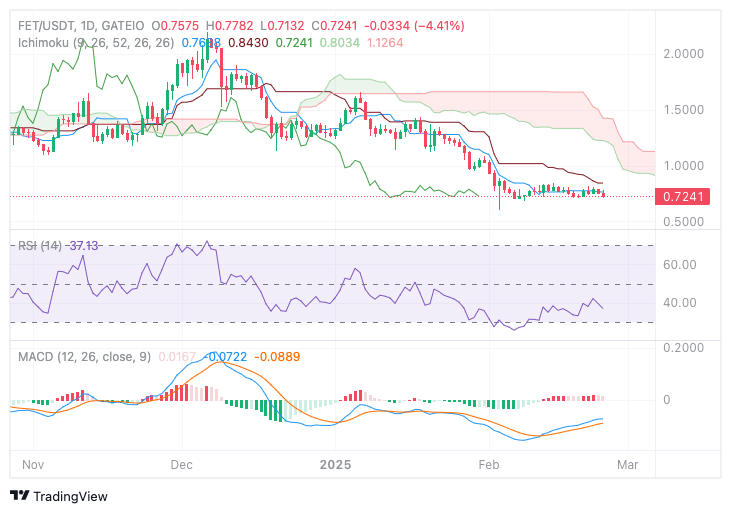 The Ichimoku Cloud analysis indicates that FET remains in a bearish trend, with the price currently trading below the cloud (Kumo) at $0.7241.