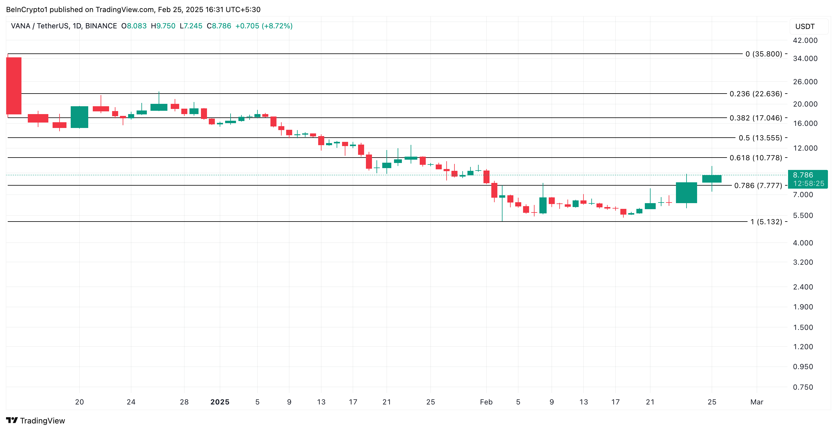 At press time, VANA trades at $8.78. Over the past 24 hours, its trading volume has totaled $639 million, surging by over 2,800% during that period. This significant hike in VANA’s trading volume indicates that its current rally is driven by demand for the altcoin.
