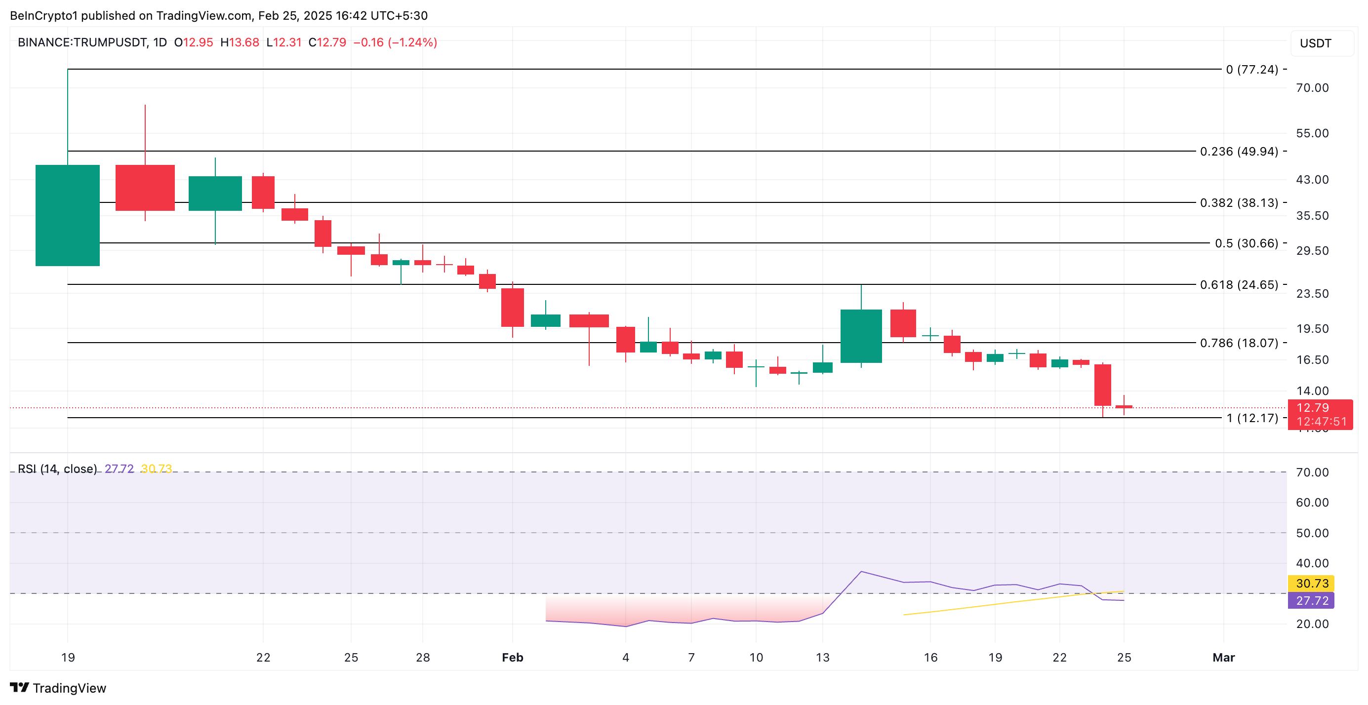 Solana-based meme coin TRUMP is one of the most searched altcoins today. It exchanges hands at $12.78, plunging 14% in the past 24 hours. Having lost 55% of its value over the past month, readings from TRUMP’s Relative Strength Index (RSI) suggest that it might be poised for a rebound.