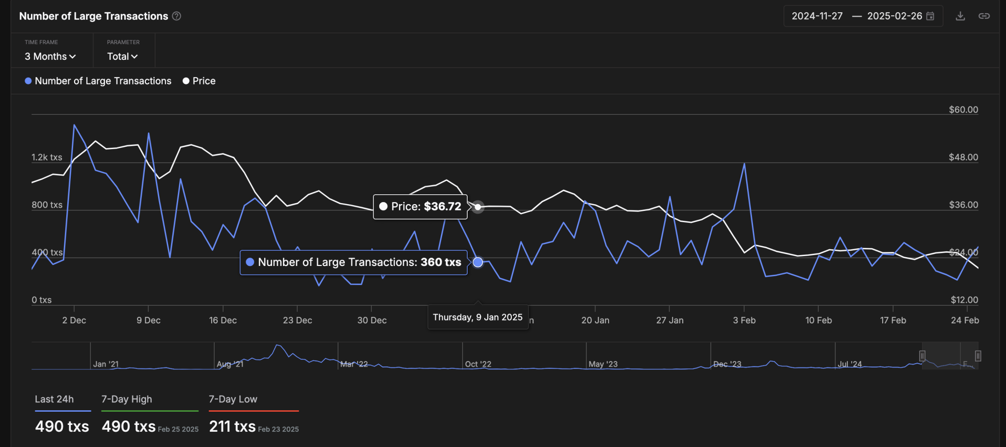 Over the last three months, whale transaction count dropped significantly, from 1.52K transactions per day to just 210. However, this trend has reversed, with whale transactions surging back to 490 on February 25.